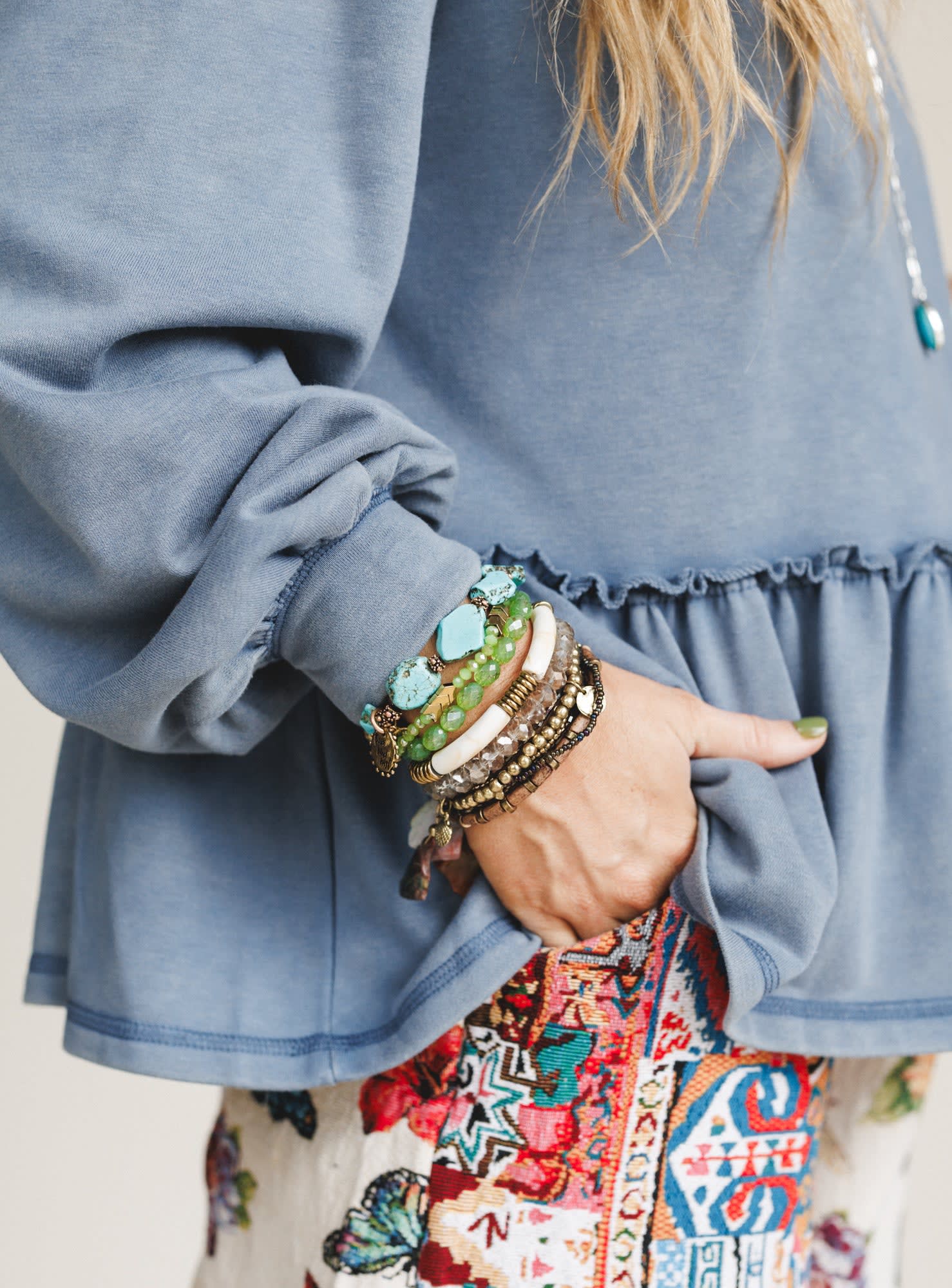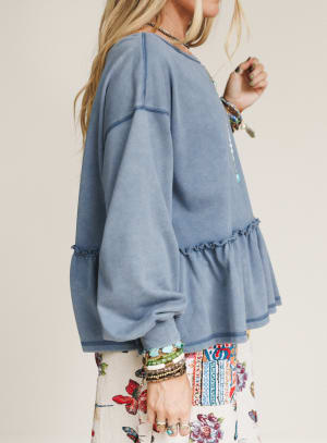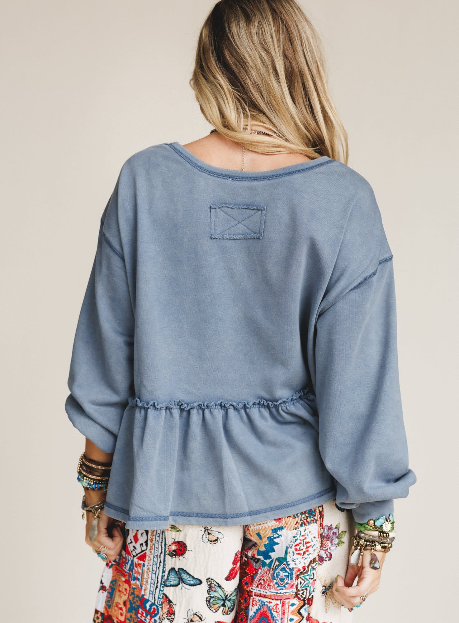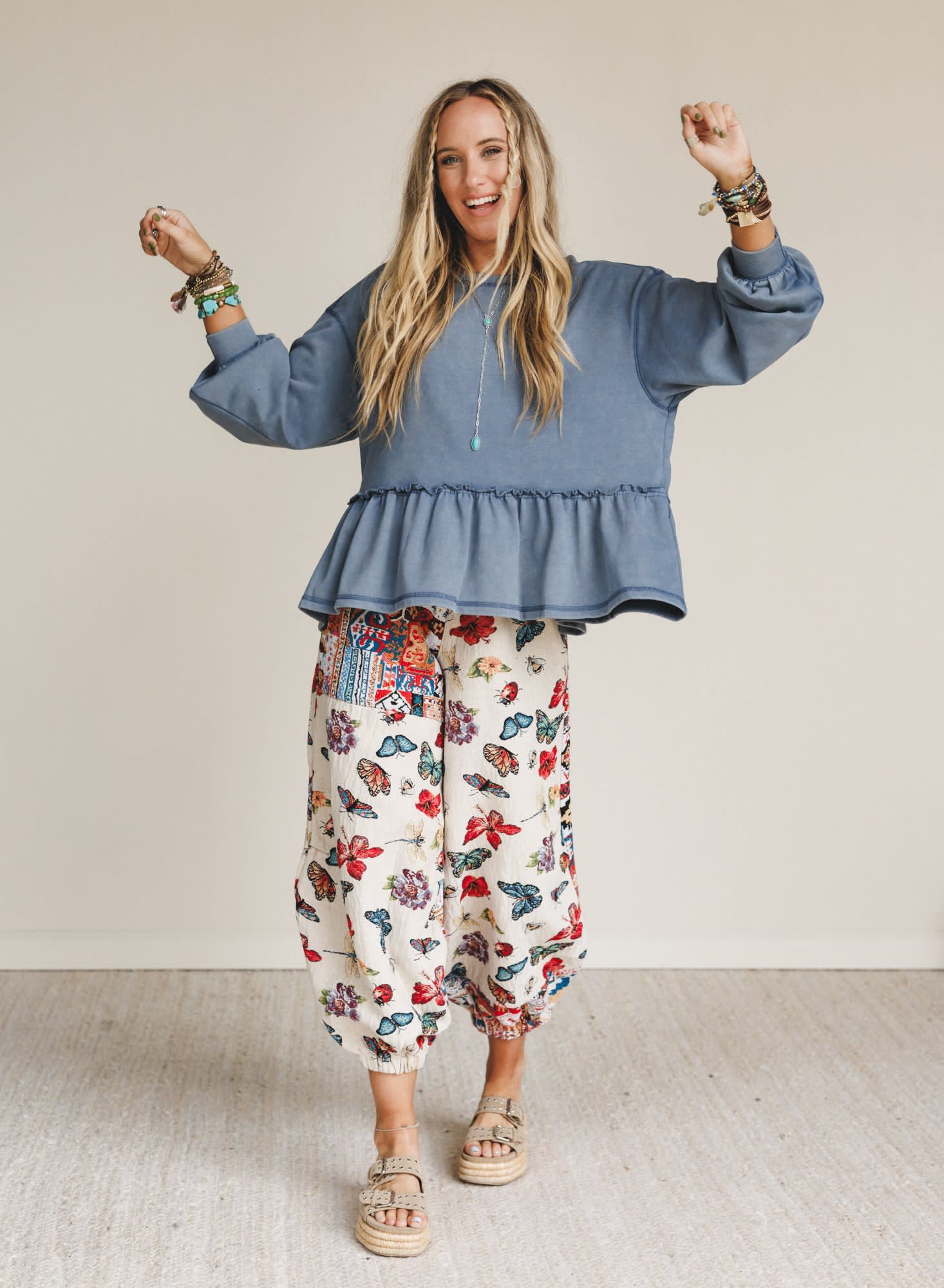 Laid-back meets lovely in the Meadow Club Top, your new favorite for effortless, everyday boho style. With its soft blue hue and flattering peplum shape, this top is made for slow mornings, sunny strolls, and everything in between.