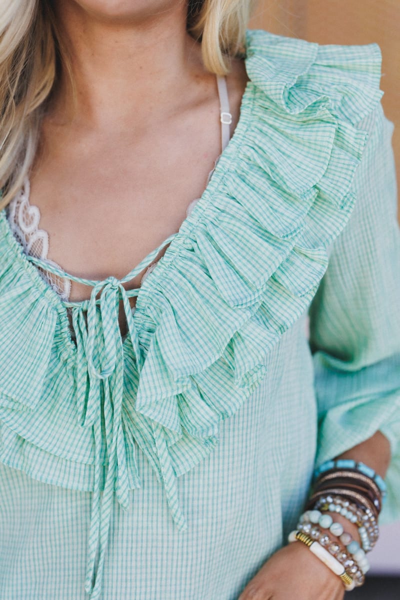 - Pair this ruffled top with a denim mini skirt and western boots for a cute casual look.