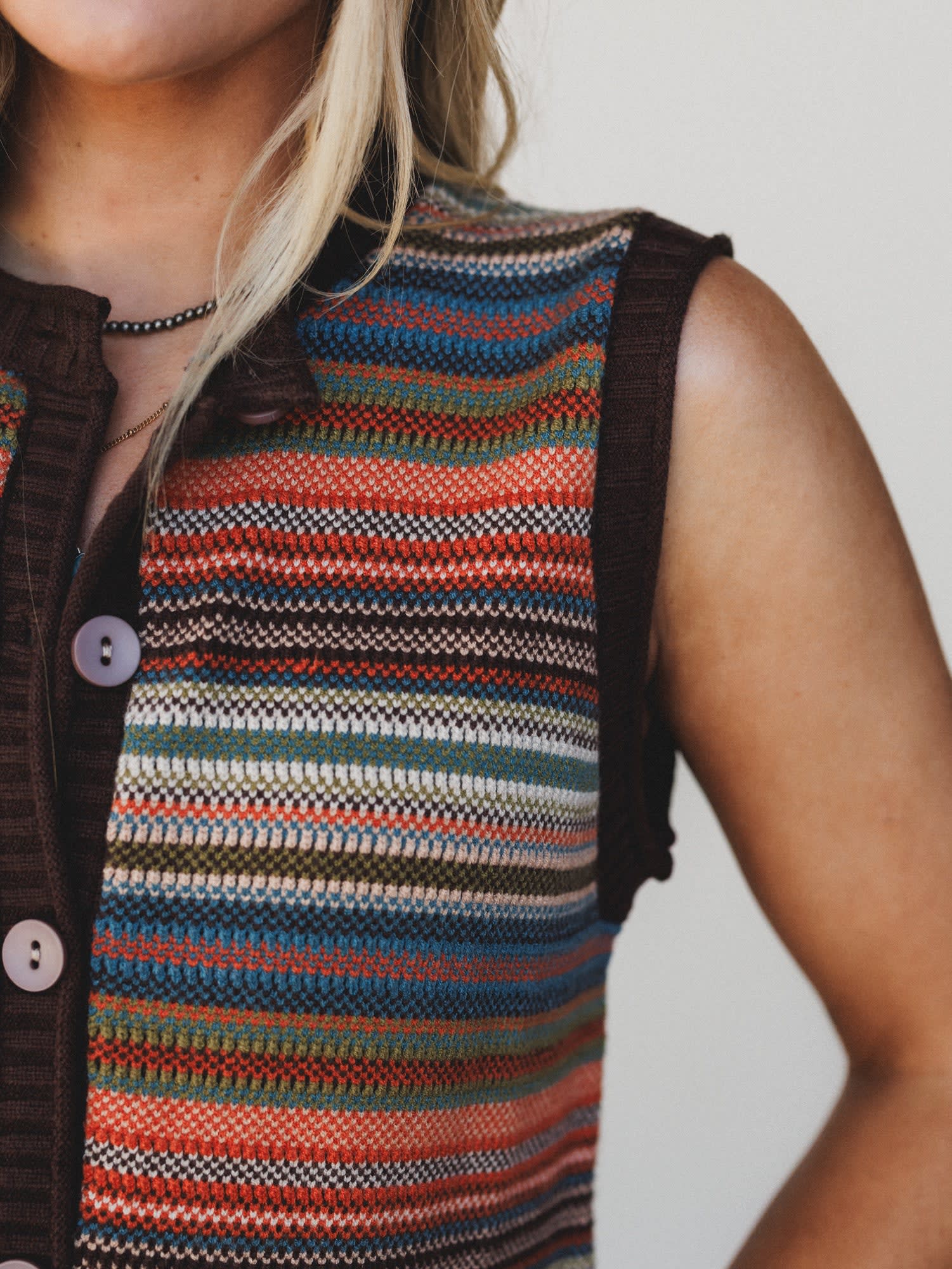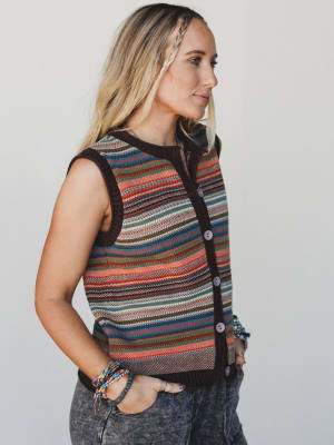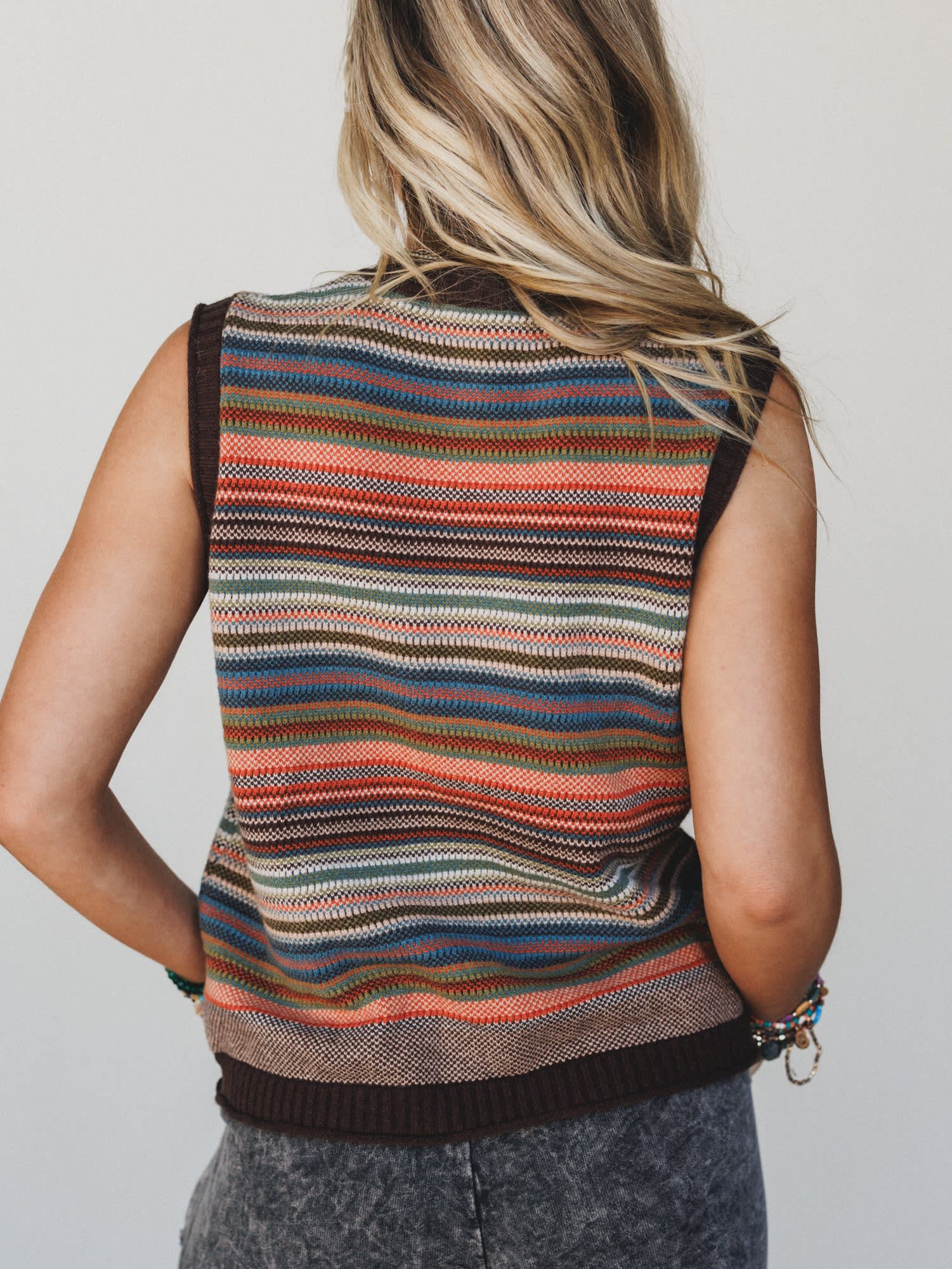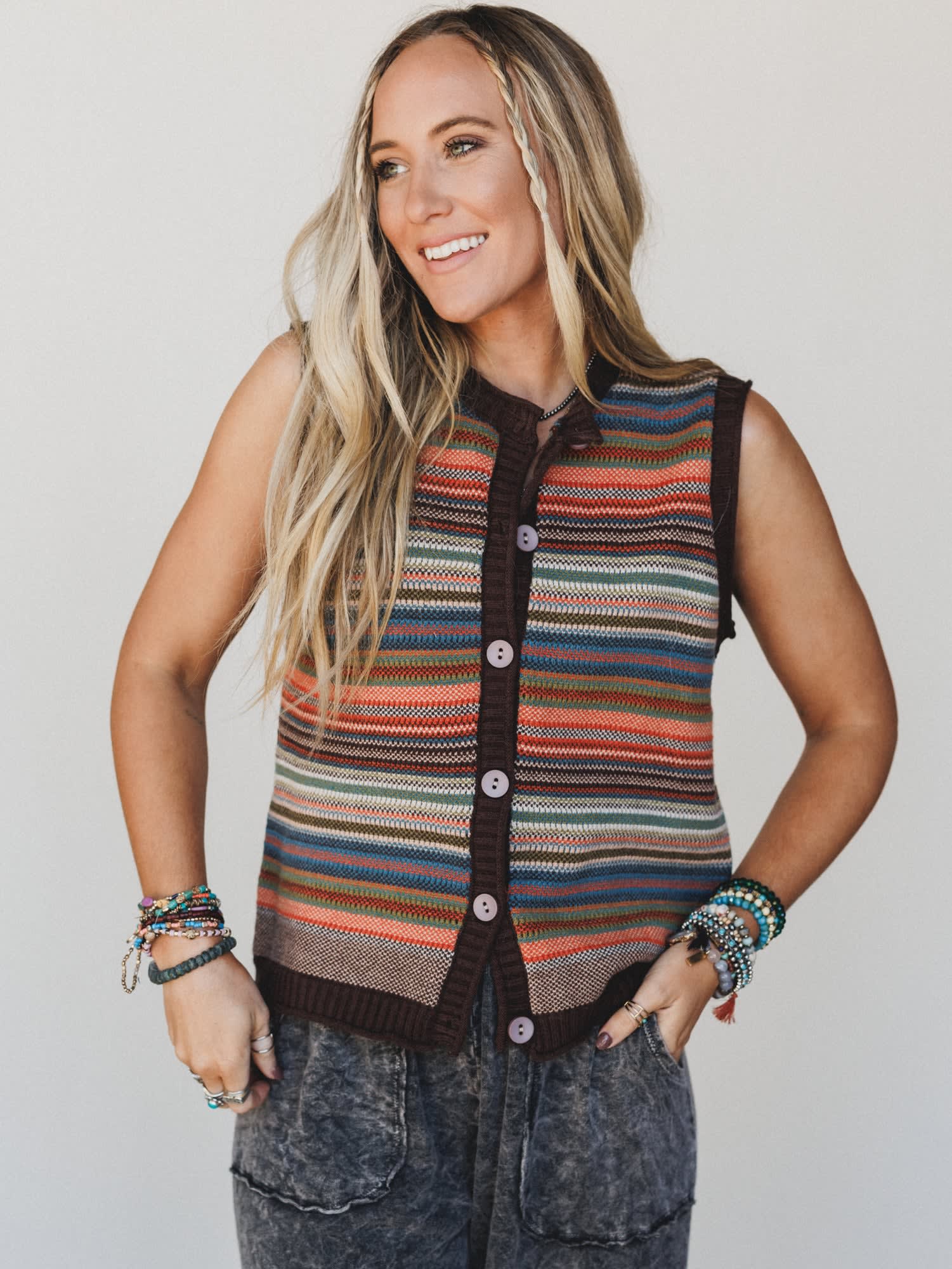 Retro meets wanderlust in the Meadow Moonrise Sweater Vest, a bold layering piece with serious personality. Whether you're headed to a backyard hang or layering up for a road trip, this colorful knit is ready to tag along.