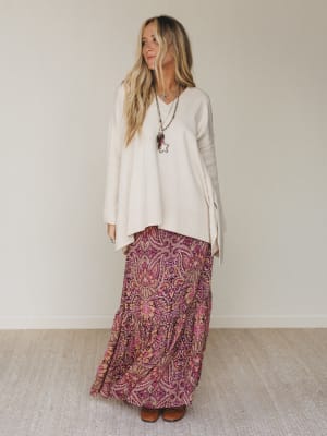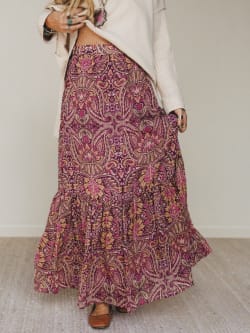 - Maxi skirt in a bold fuchsia and ochre boho print with breezy tiers and all-day comfort