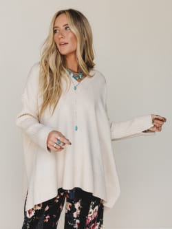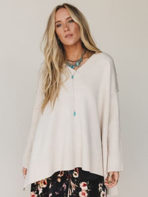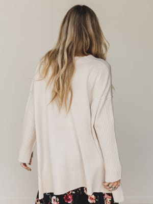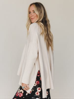 - Oversized oat-toned sweater with ribbed sleeves and slouchy, comfy fit