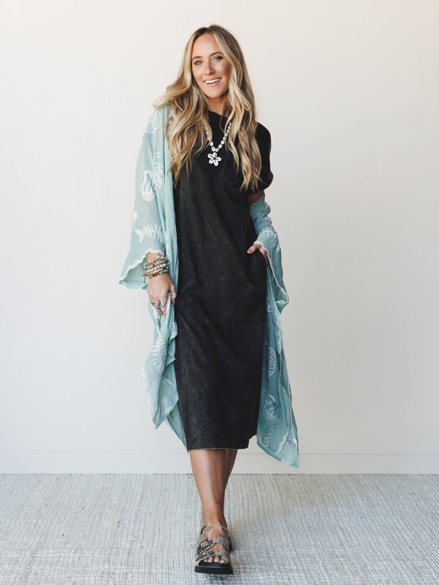 - Flowing kimono duster features an enchanting seashell print and open front silhouette that moves beautifully in ocean breezes.