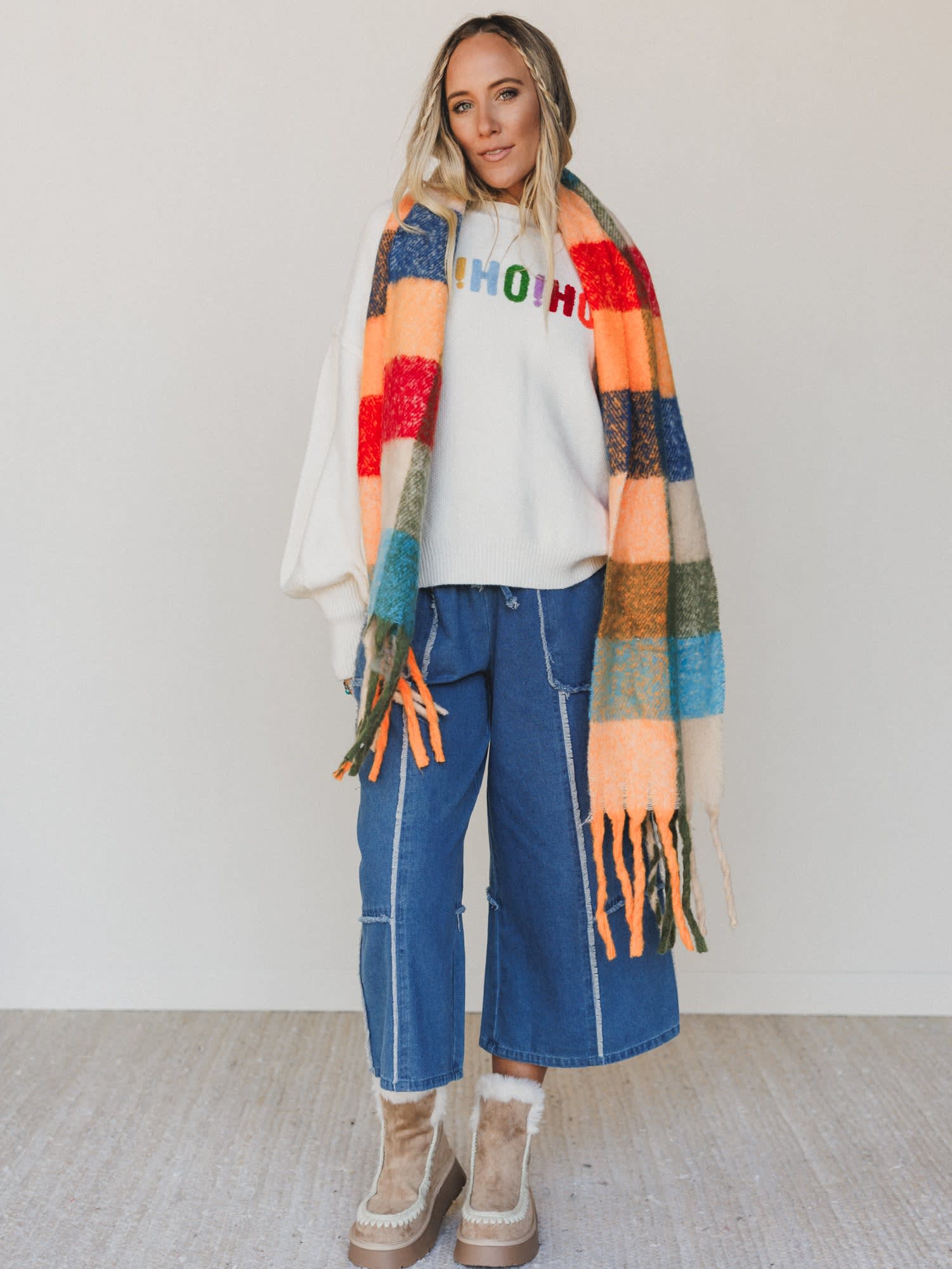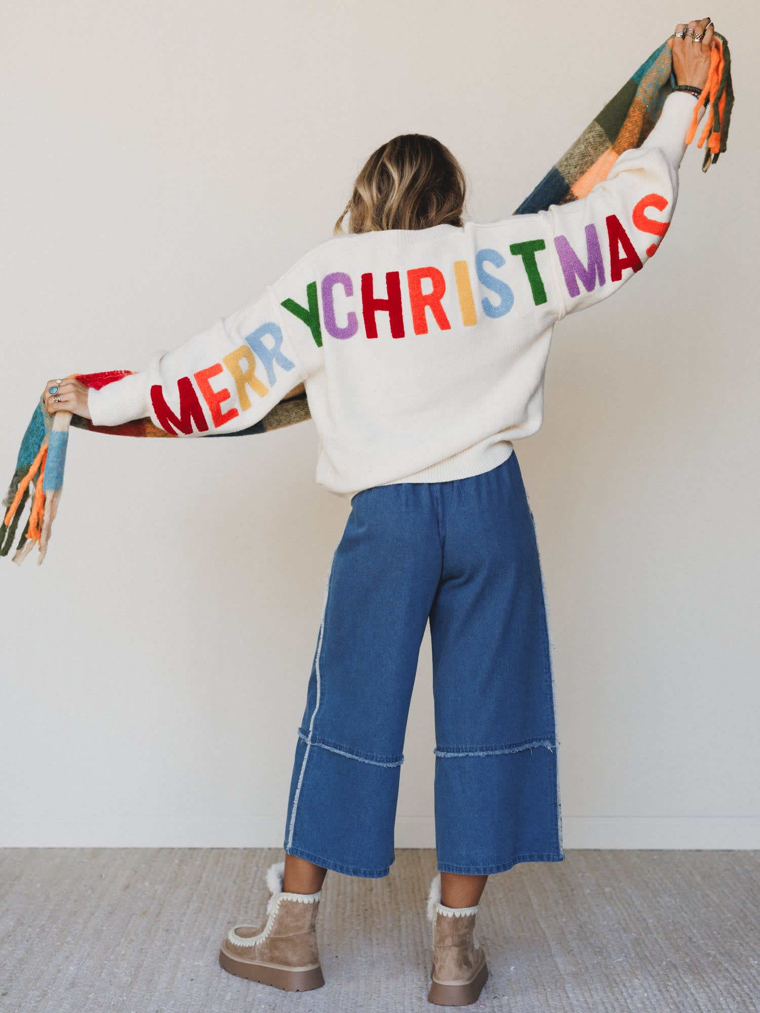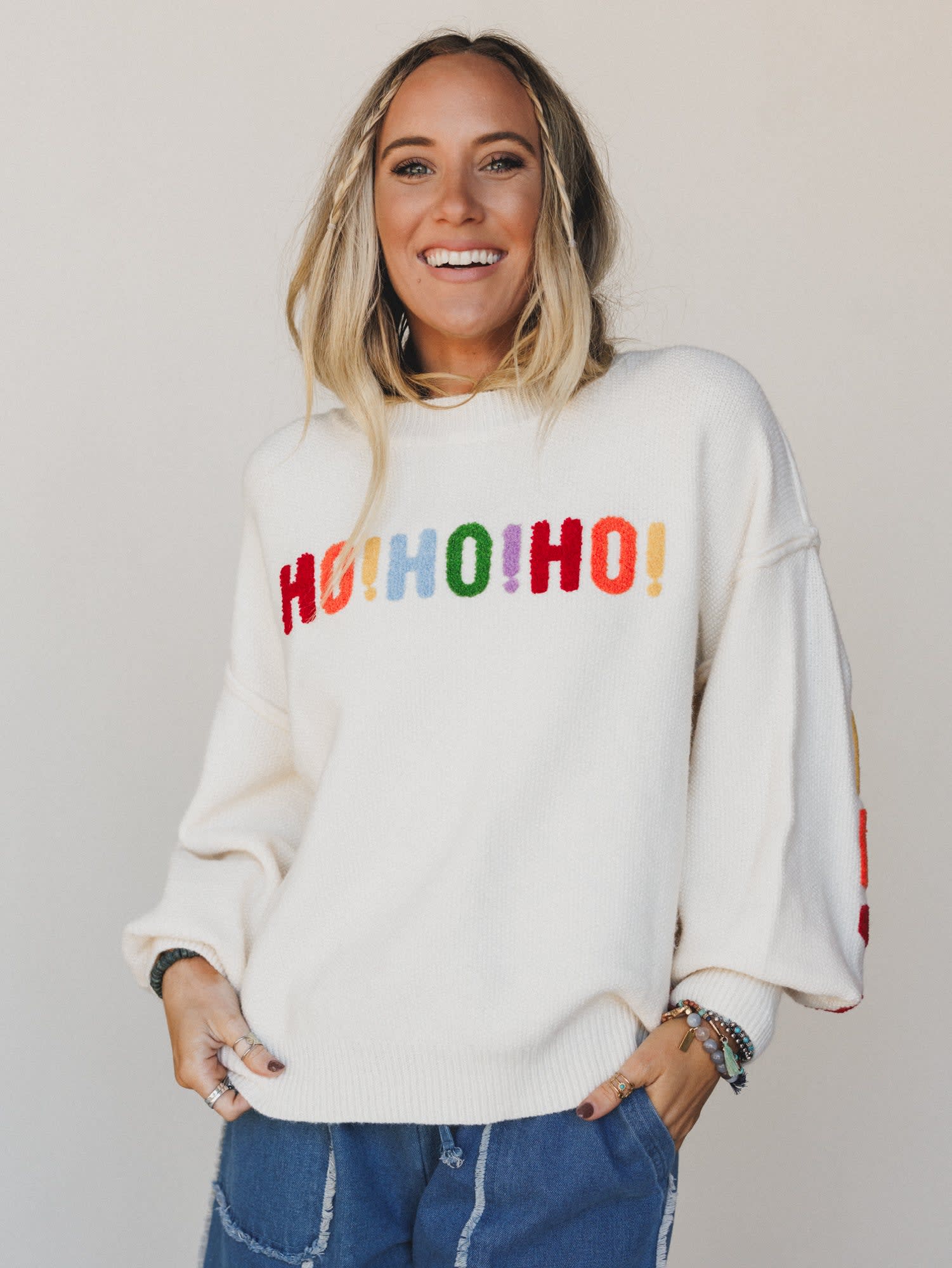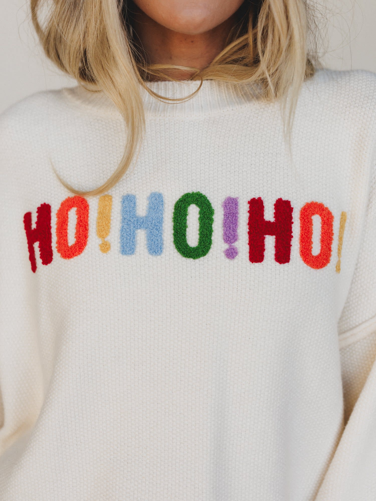 - Merry Drift Sweater: A cream knit pullover that says it all—“HO! HO! HO!” in vibrant rainbow lettering on the front and “MERRY CHRISTMAS” wrapping around the sleeves and back. Ultra-soft and made to spread joy.