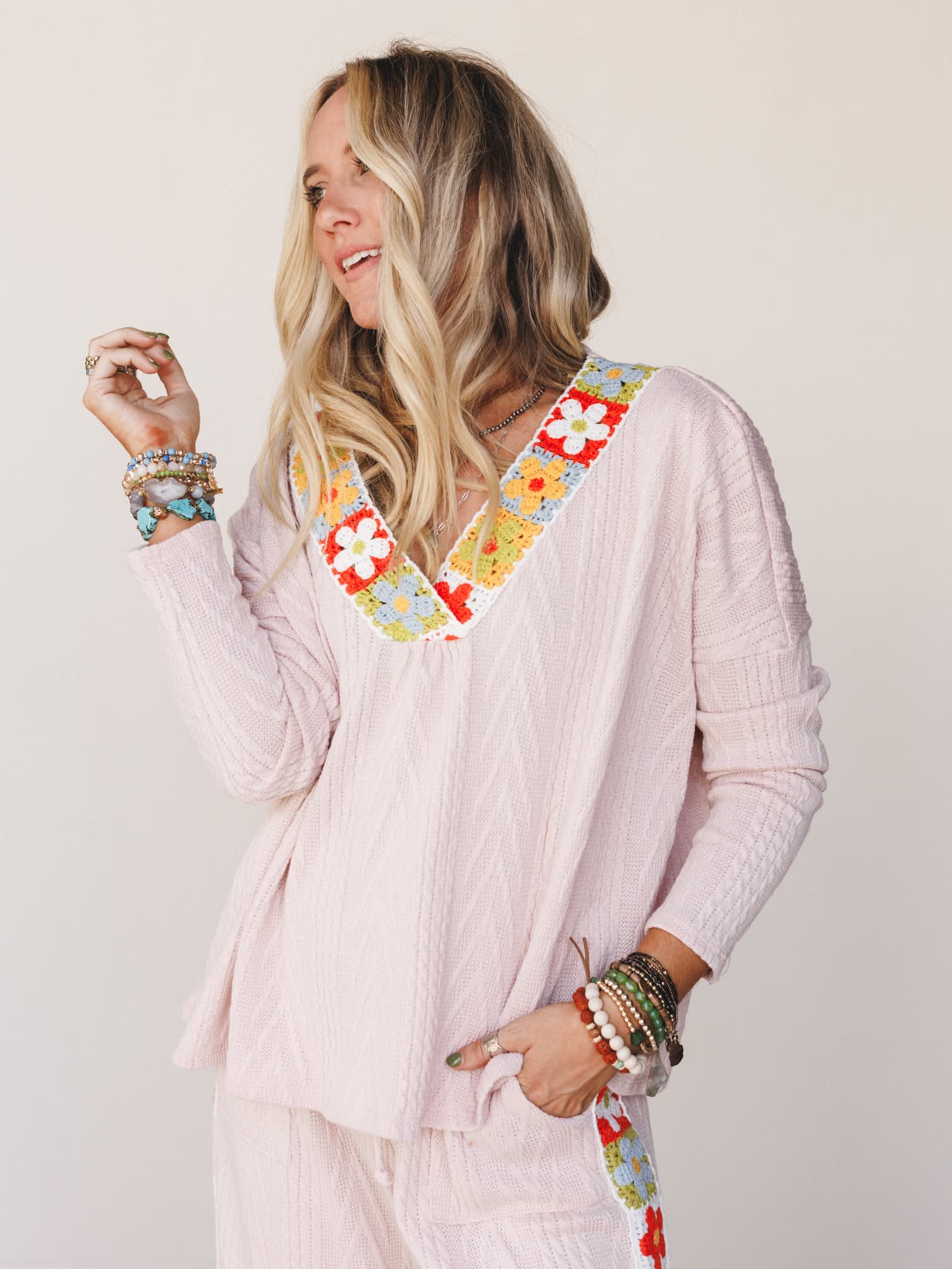 - Textured pullover in soft taupe with a colorful crochet floral neckline that pops with playful detail