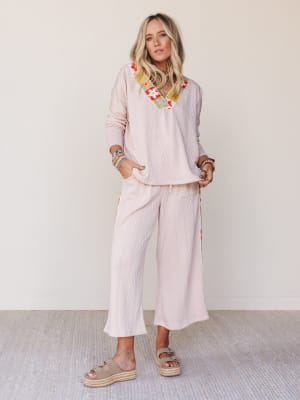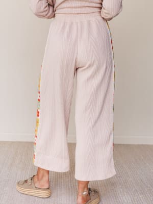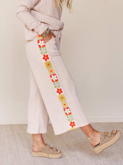 - Coordinating wide-leg pants with side crochet paneling that gives a peek of vintage-inspired flair