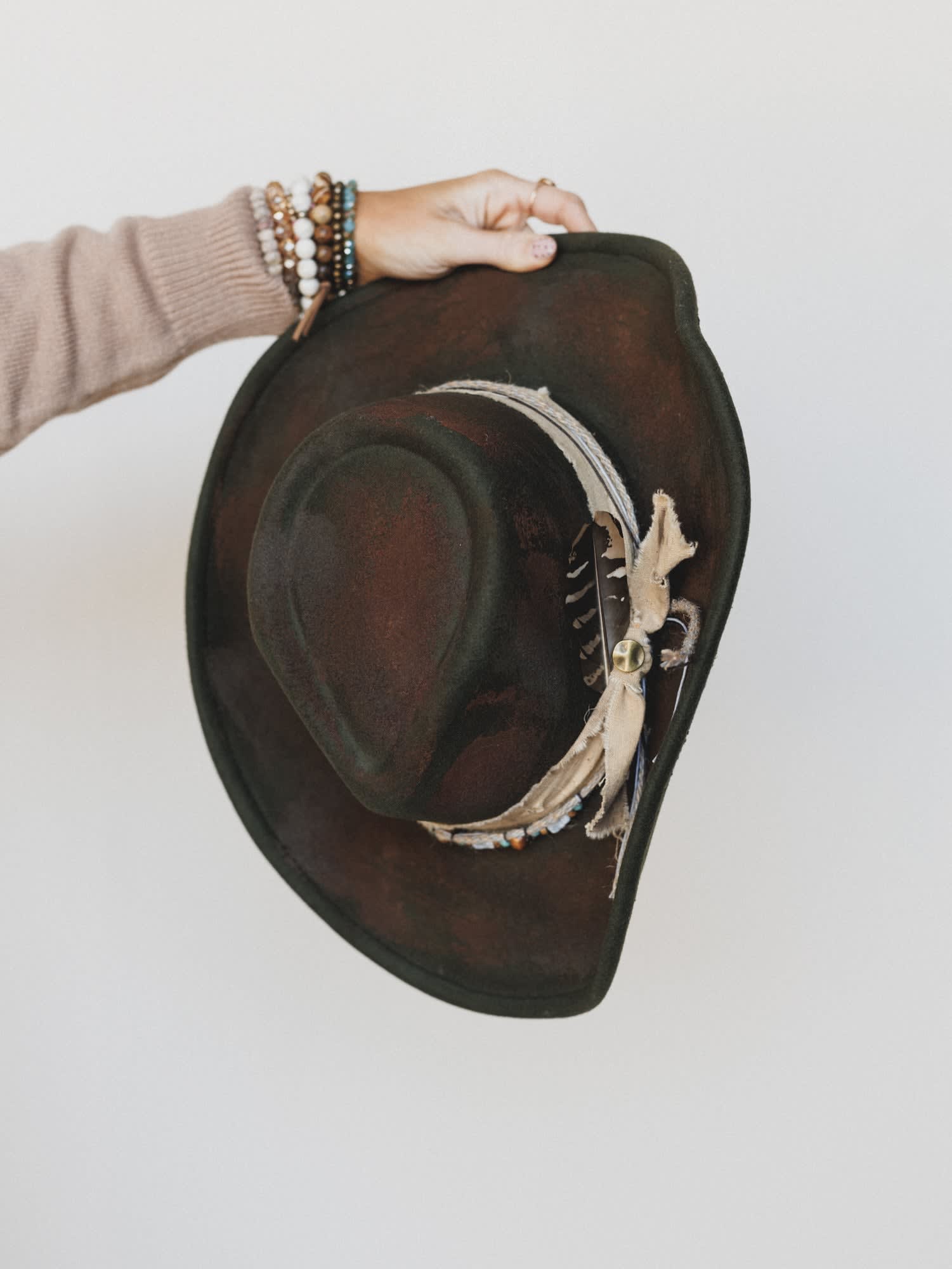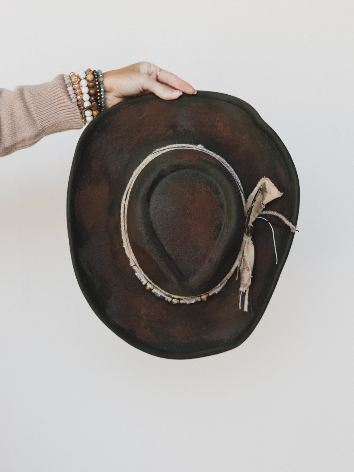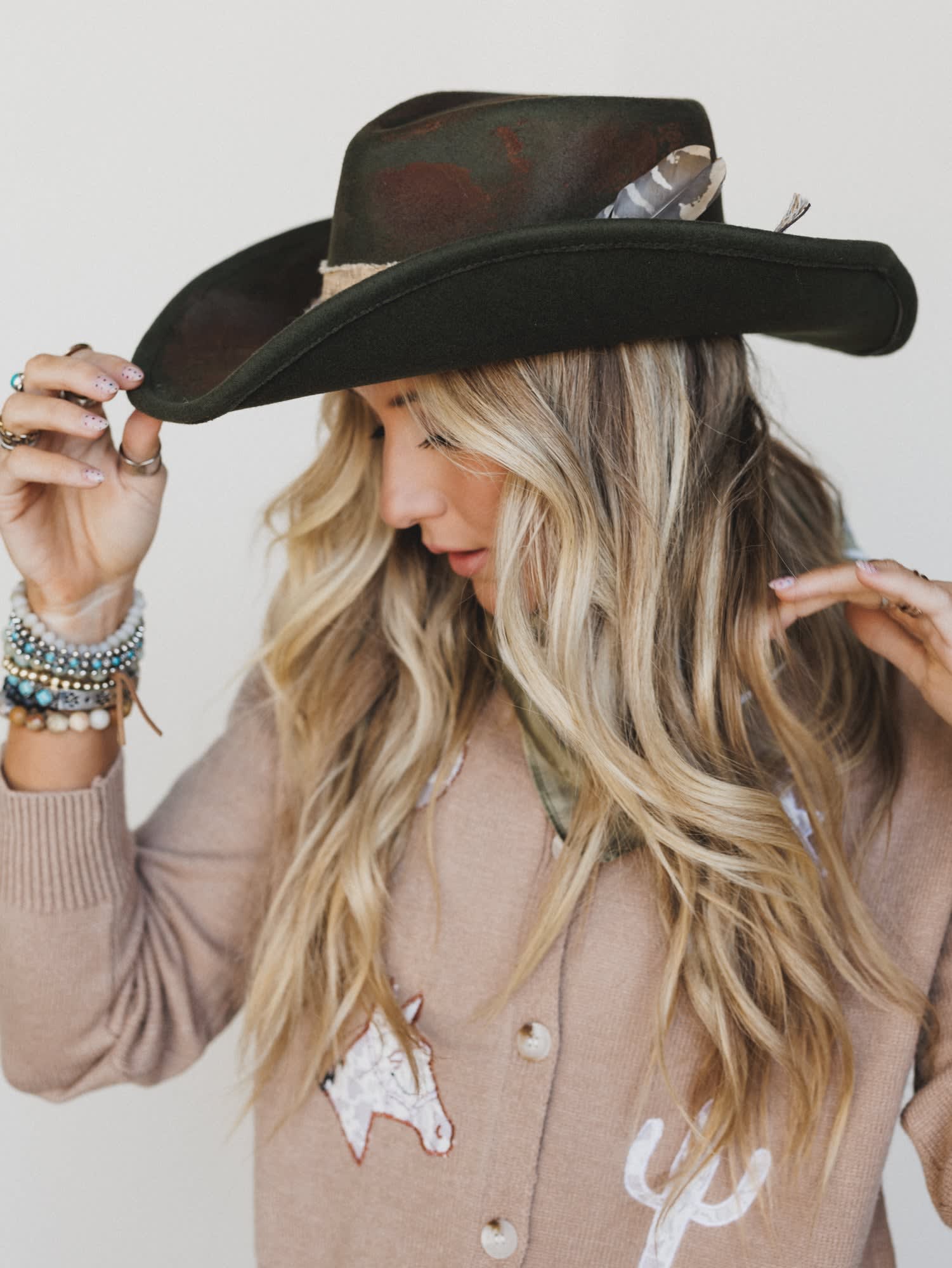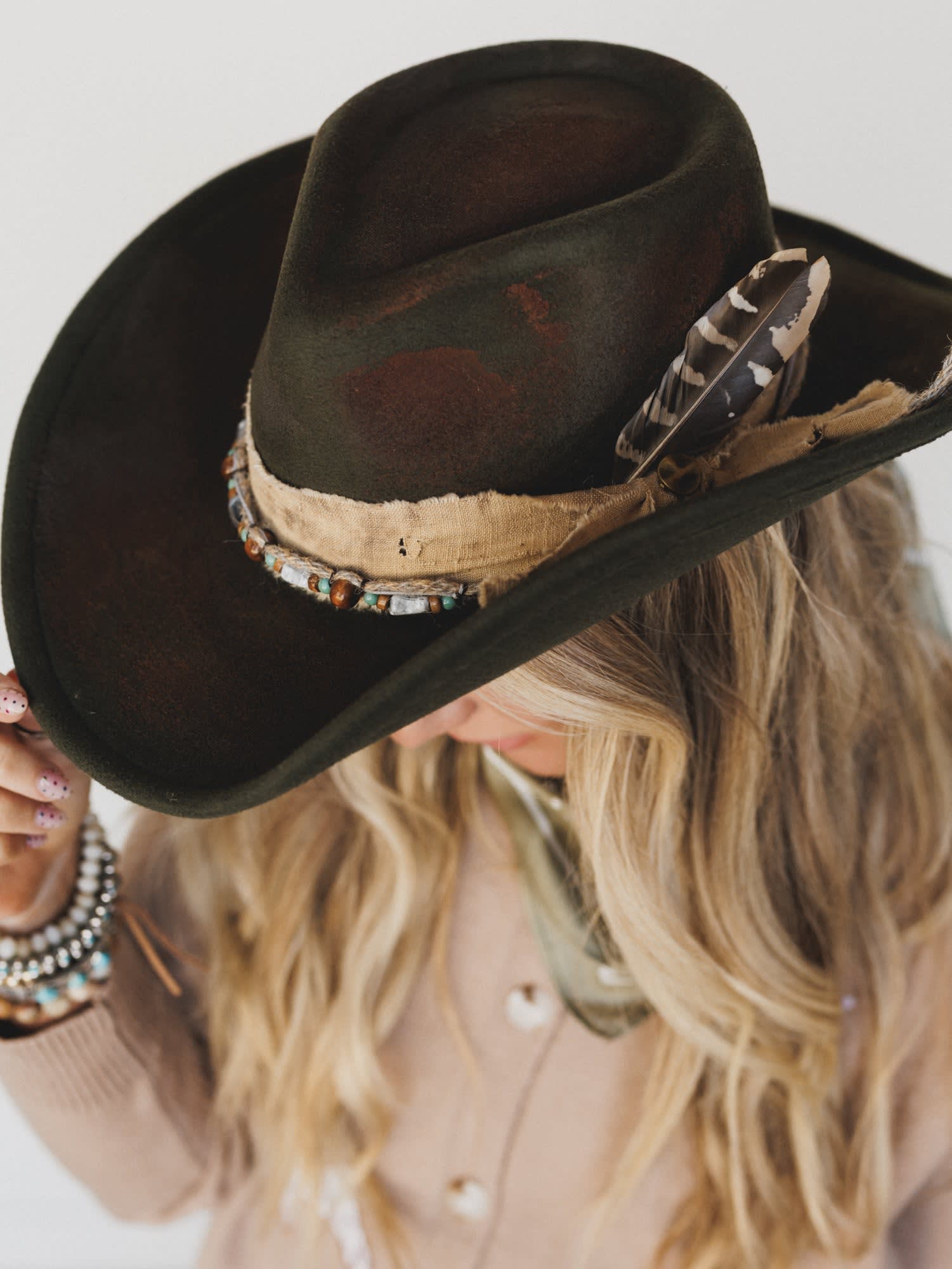 This is the kind of statement piece you grab when planning a country concert outfit or styling what to wear for fall family photos. With its rich olive tone and perfectly worn-in details, this western hat adds instant character to any boho look.