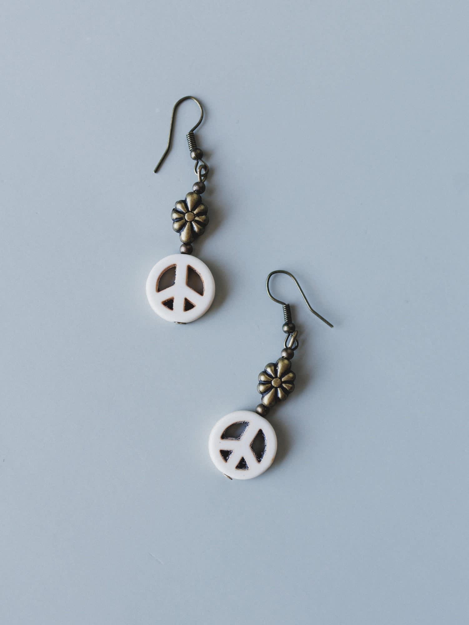 • Features a carved white stone peace sign charm suspended from an antiqued brass daisy bead and wire hook — a sweet combination of hippie boho symbols that feels fresh, not costume-y.