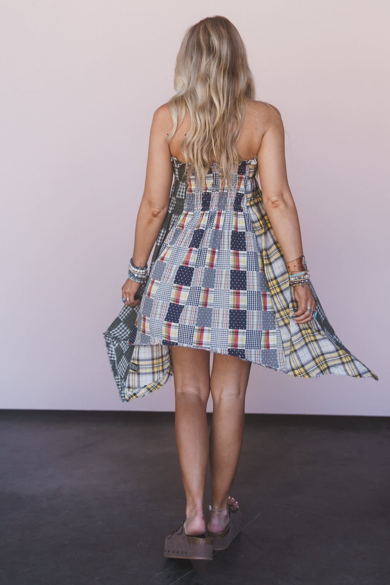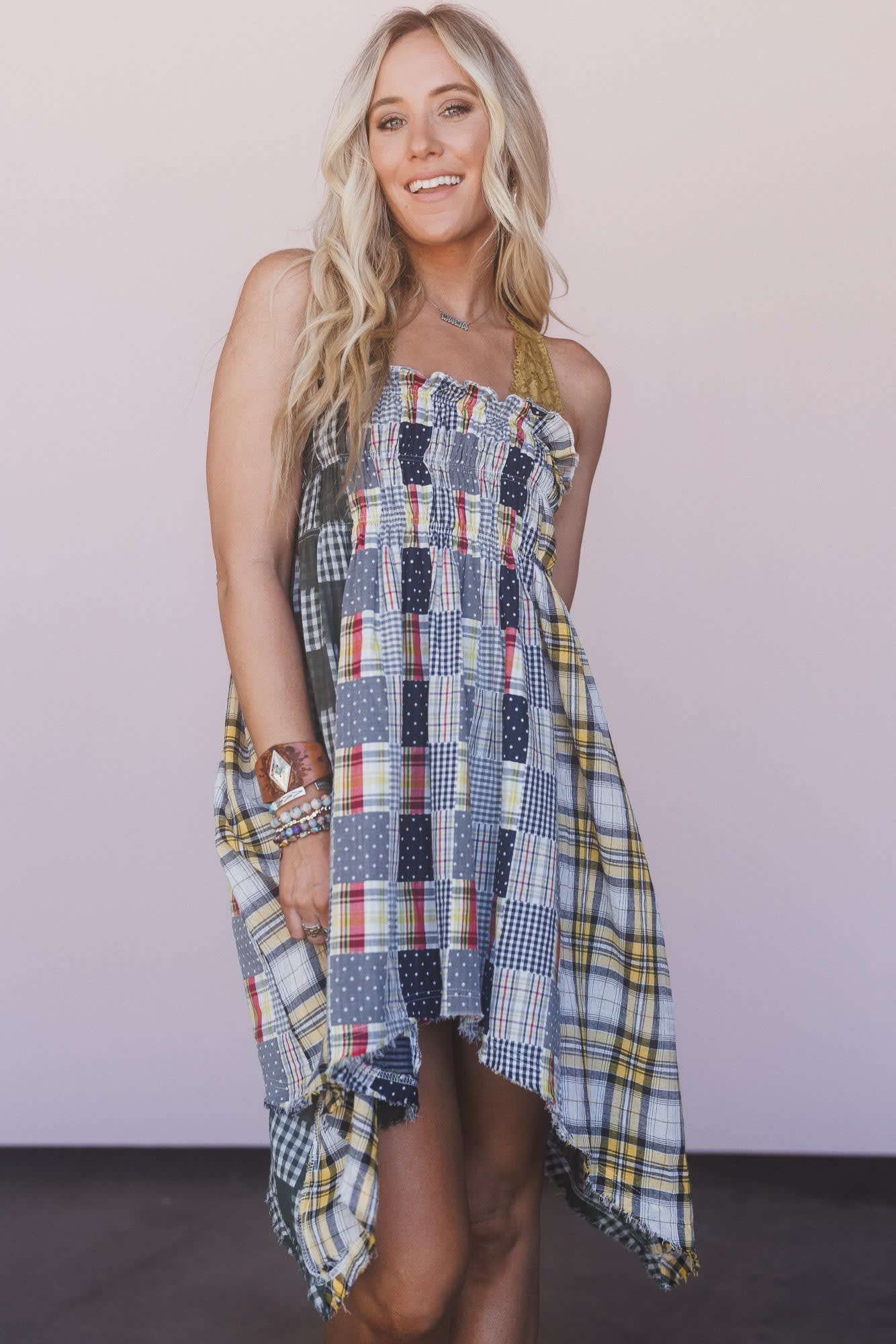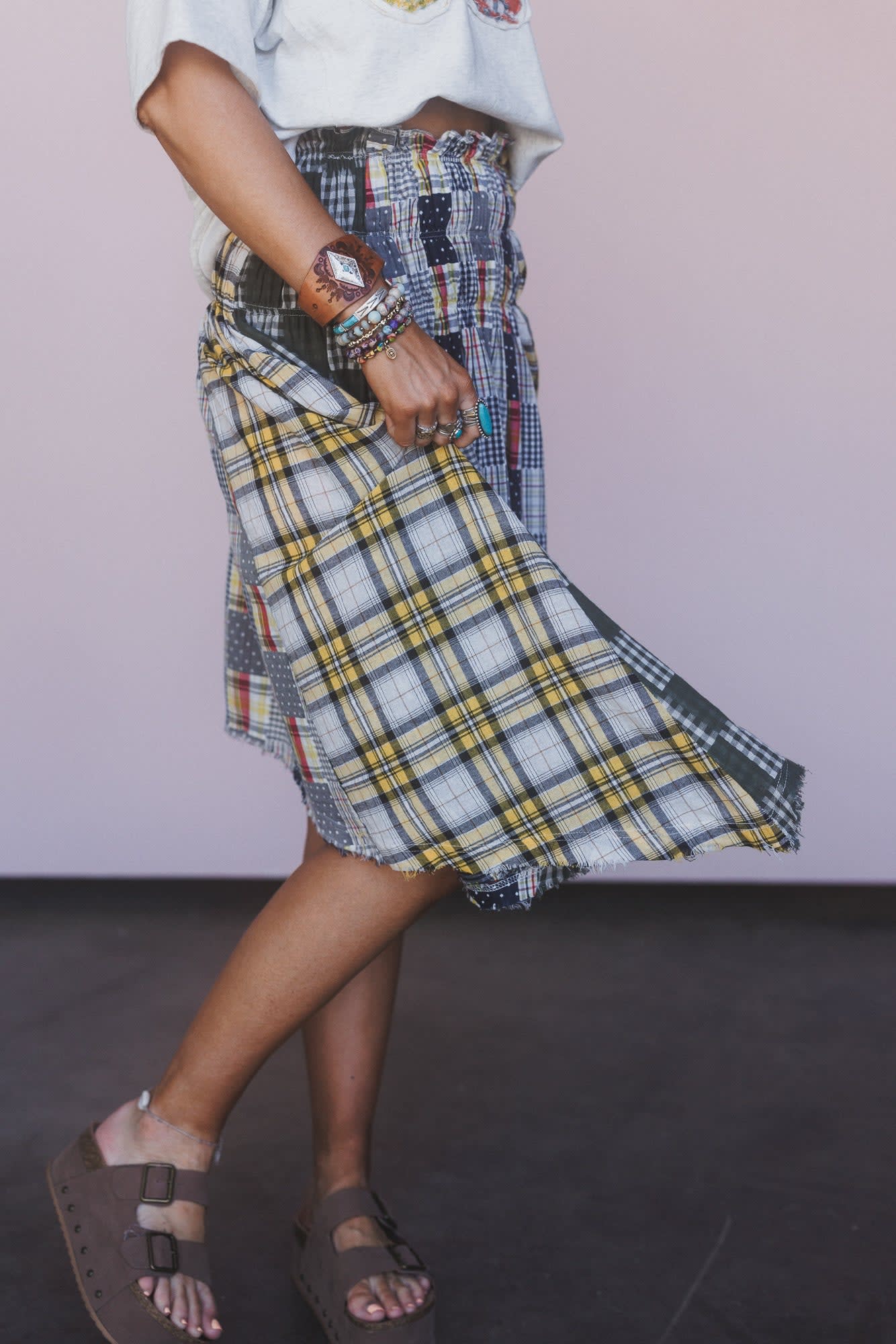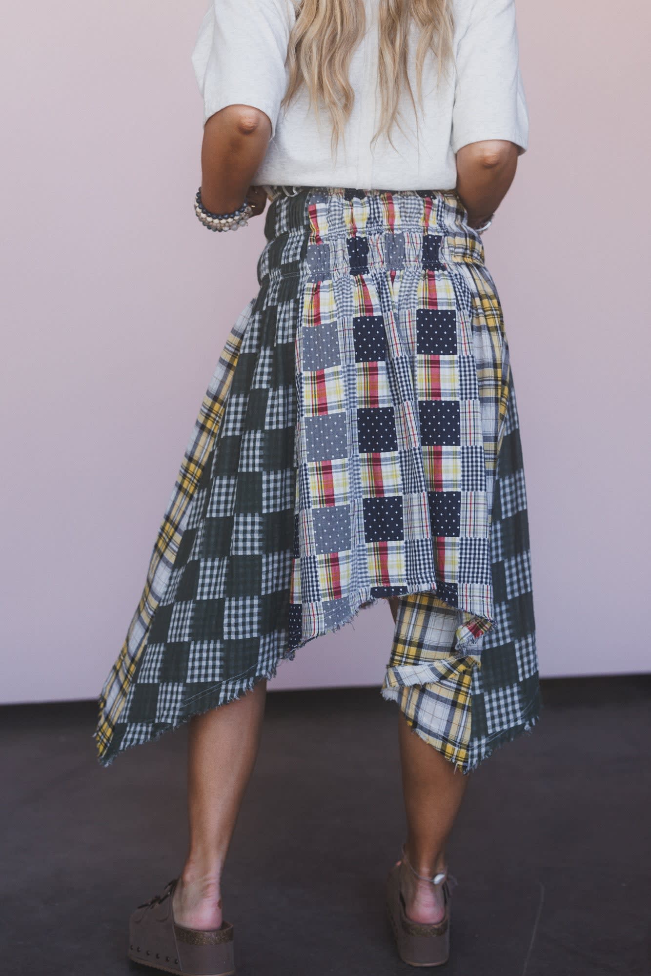 This boho skirt features the perfect mix of contrast, plaid printed, and cotton gauze fabrics.