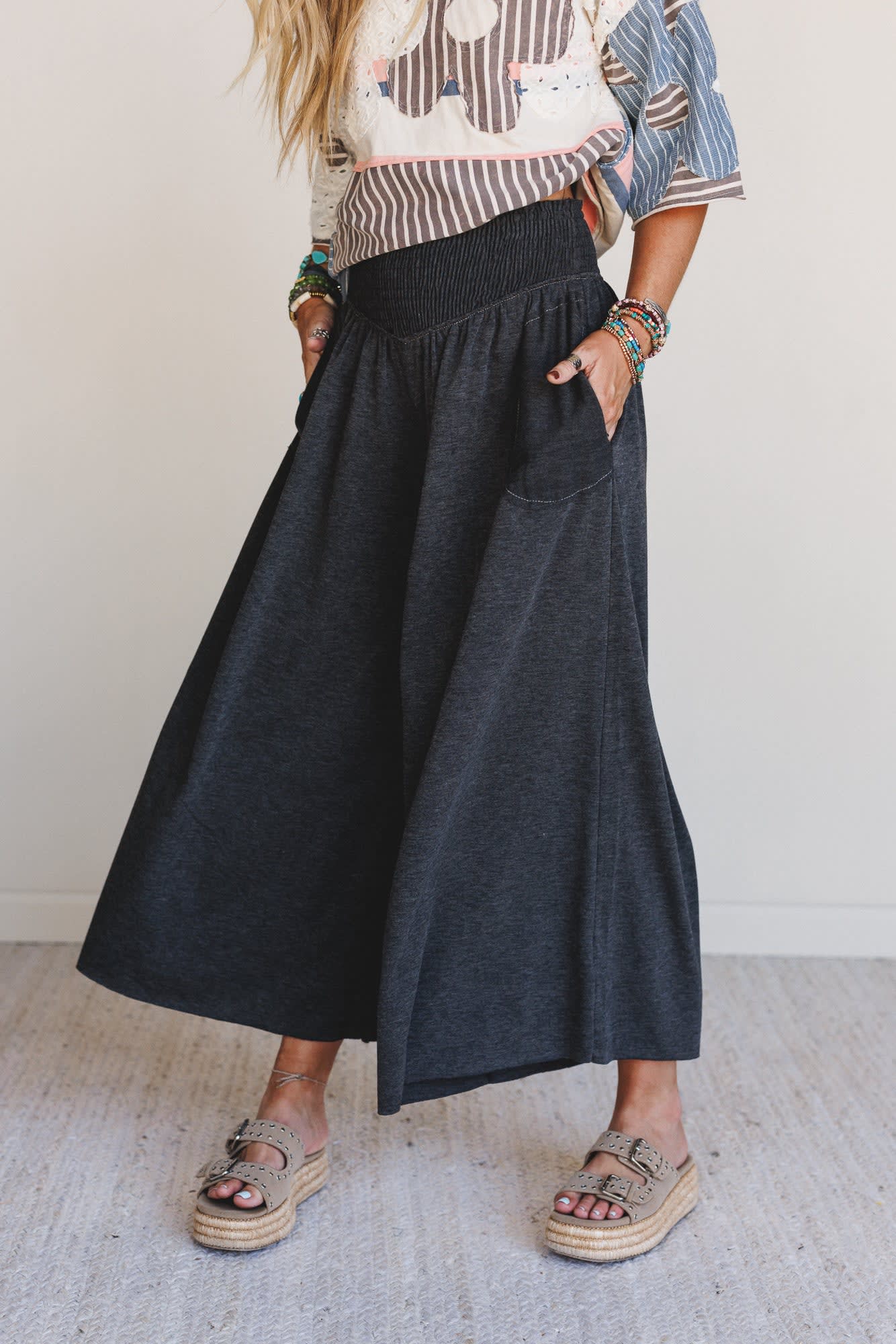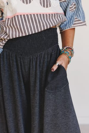 - Wide-leg pants in ultra-soft knit with a flattering smocked waistband and roomy pockets (yes, they’re as comfy as they look)