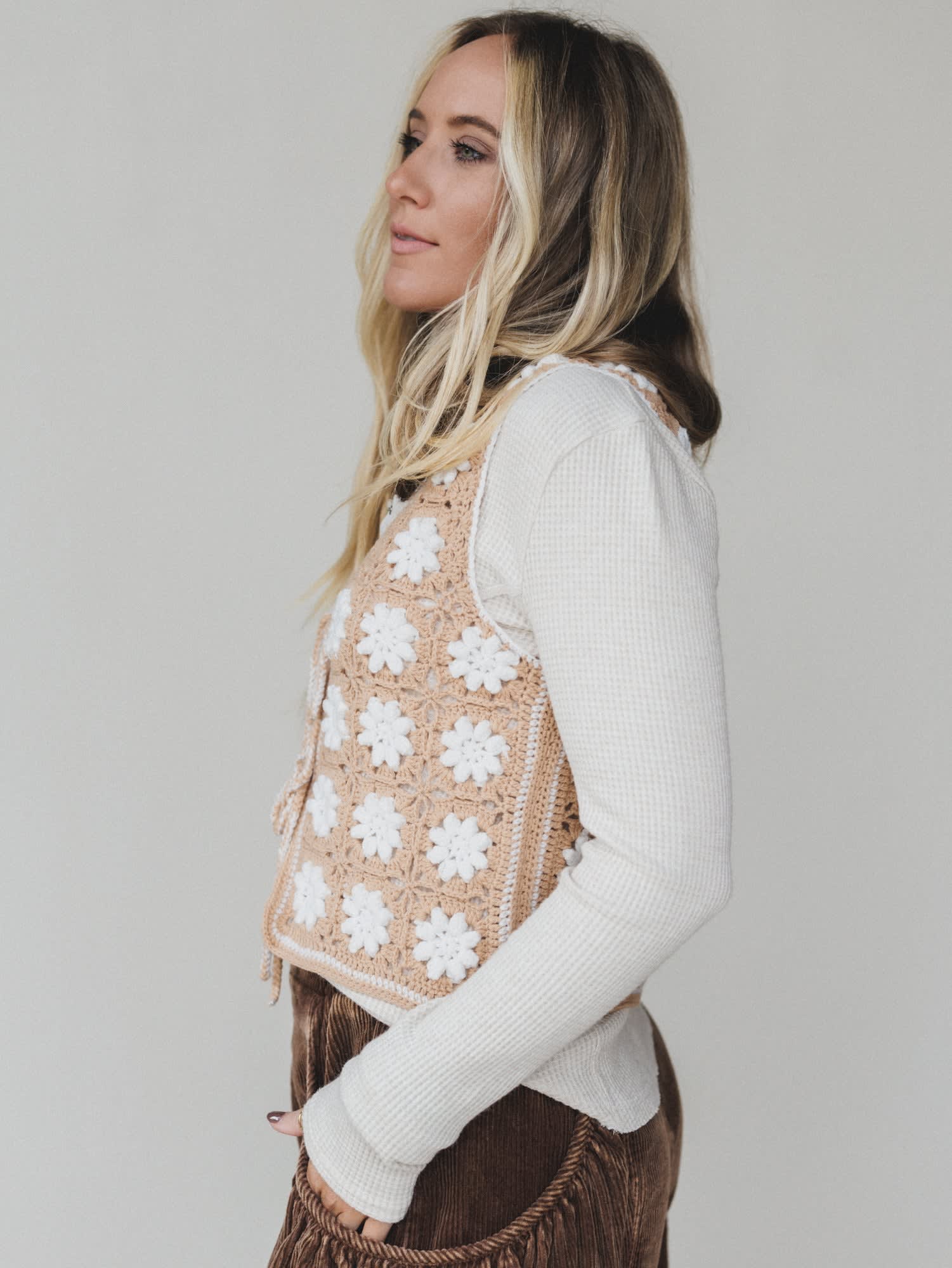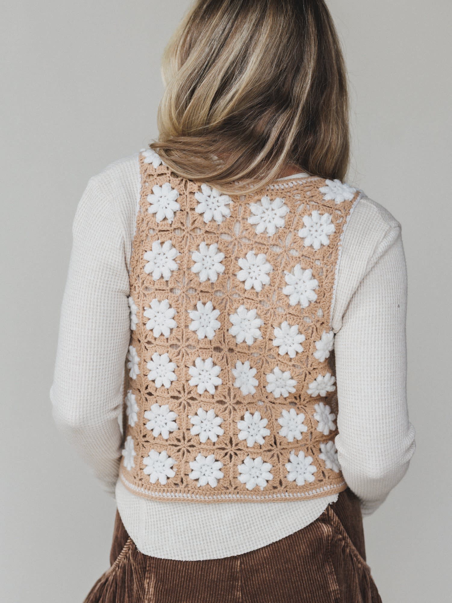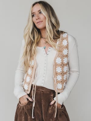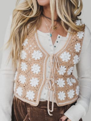 Straight out of a vintage dream, the Moonflower Crochet Vest is a hand-crafted layering piece that instantly adds charm to any outfit. With its daisy-like granny squares and warm neutral tones, it’s the kind of top that turns heads and sparks conversations.