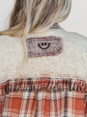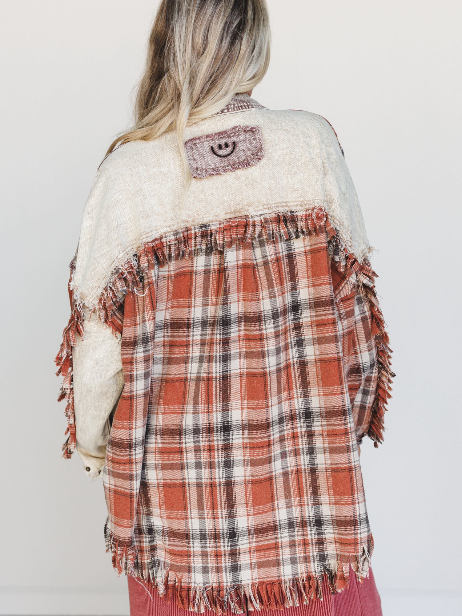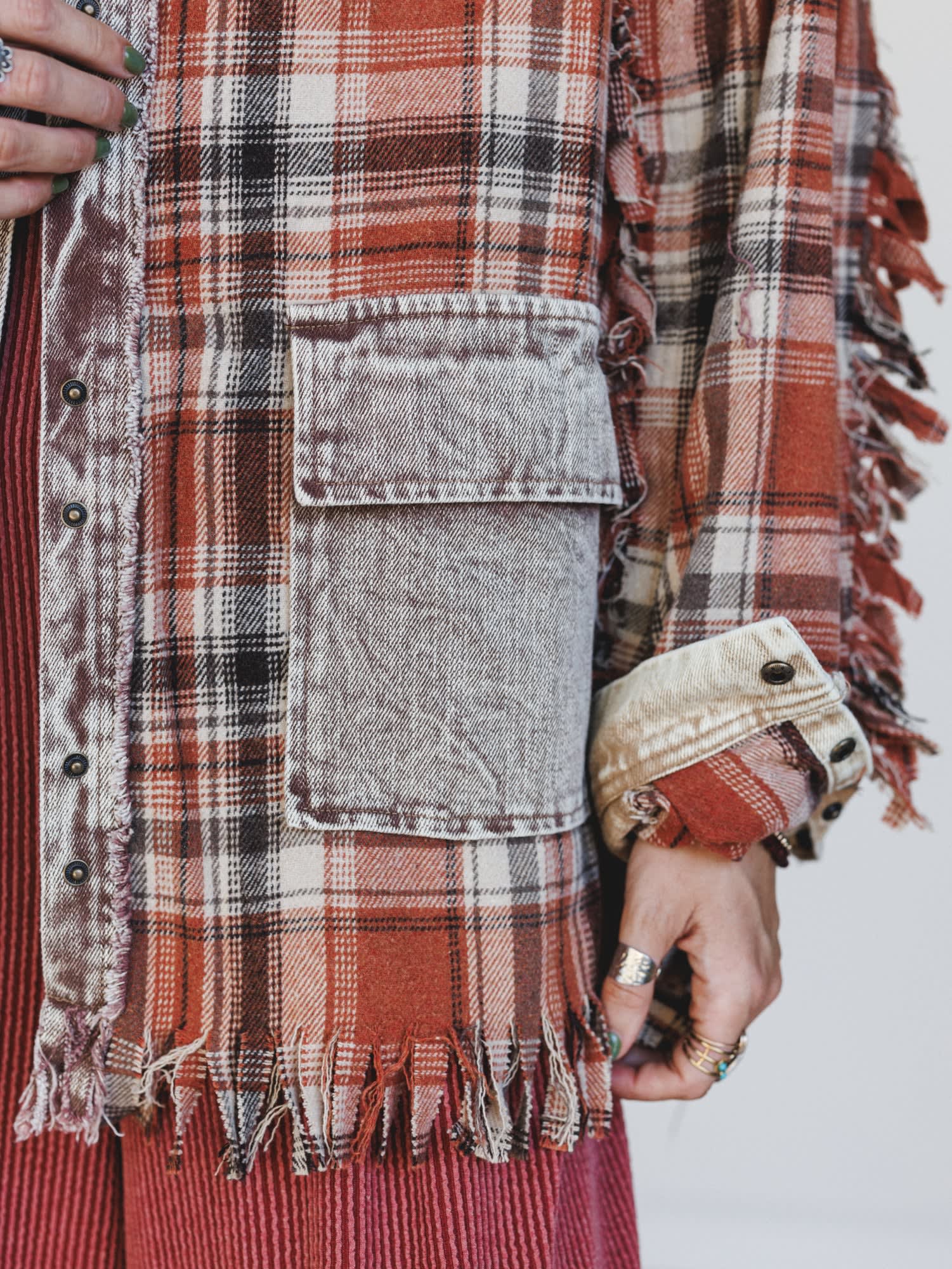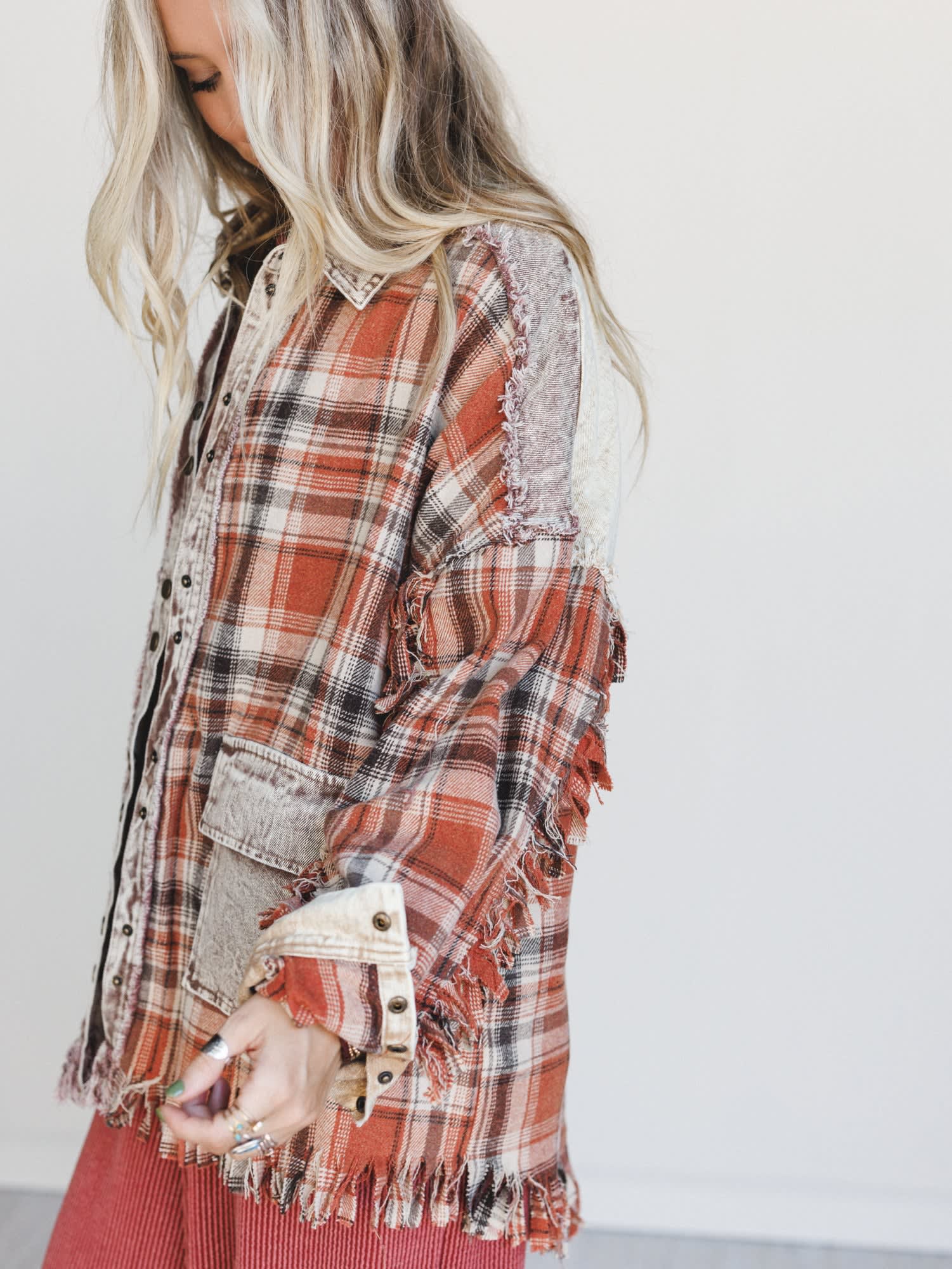Infuse your wardrobe with rustic charm and playful detail in the Moonlit Plaid Top. Featuring a patchwork design with plaid, velvet accents, and raw-edge fringe, this oversized button-down offers an eclectic twist on a fall favorite. With its laid-back, vintage vibe and comfy silhouette, it’s perfect for layering through the seasons.