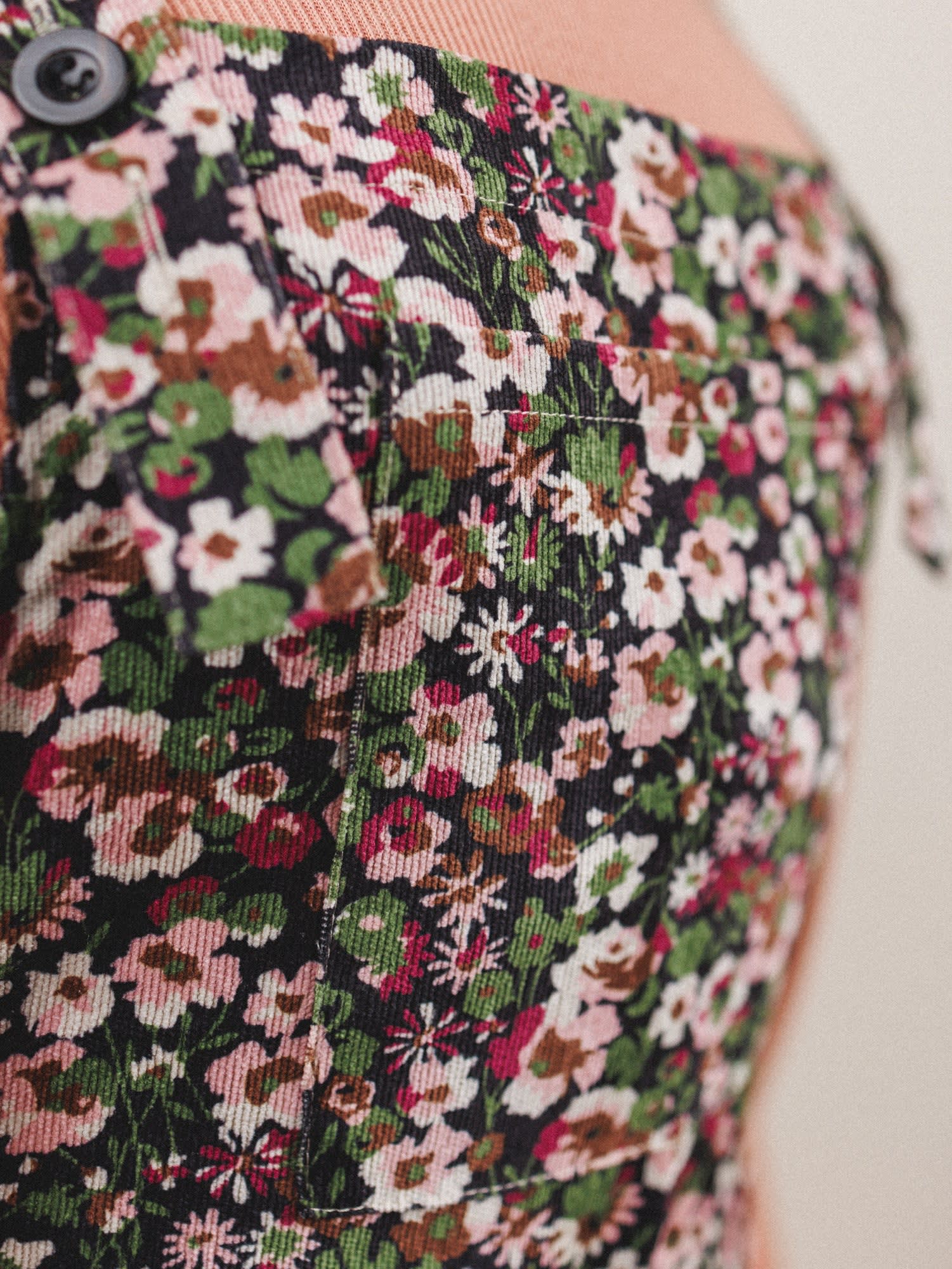 • Allover ditsy floral print on soft, textured corduroy for a retro boho feel