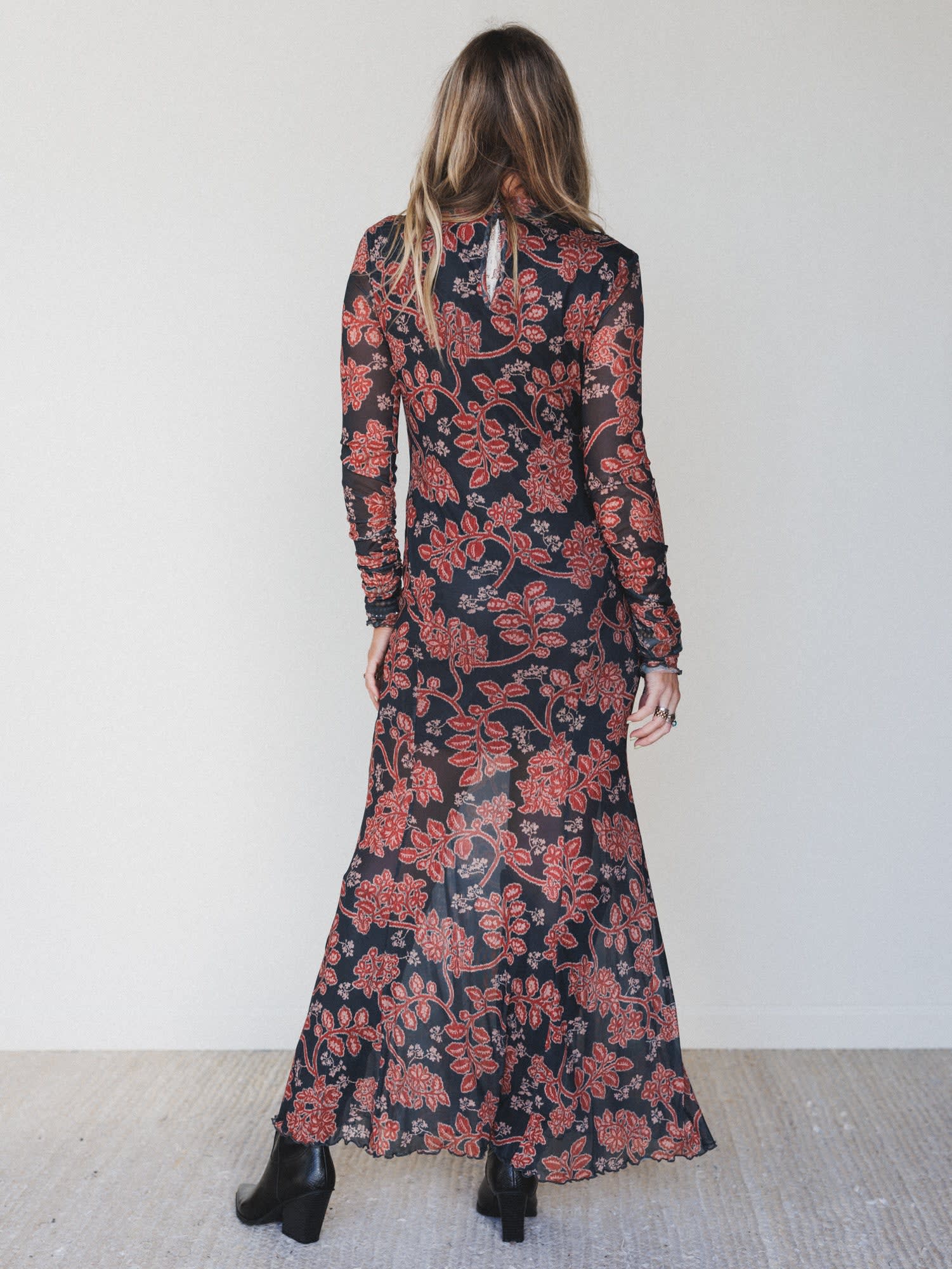 - Sheer mesh fabric with burnt red floral print on a deep charcoal base