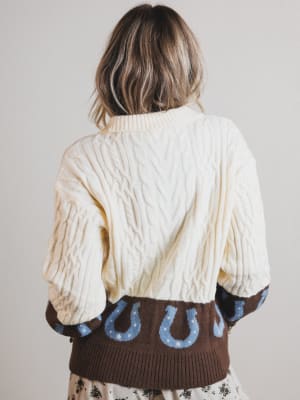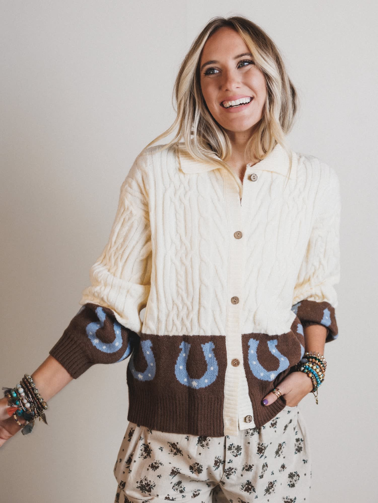 Channel cozy western charm with the My Lucky Sweater Cardigan—a must-have knit that’s equal parts sweet and spunky. With chunky cable stitching and playful horseshoe graphics, this cardigan is your new layering love for crisp mornings and cool desert nights.