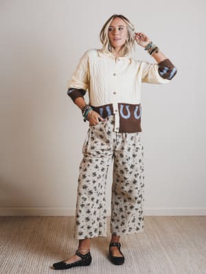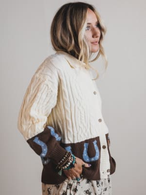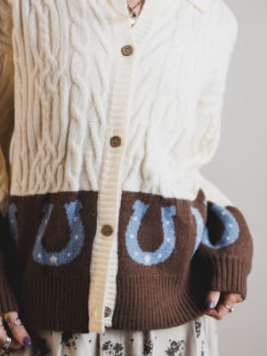 Channel cozy western charm with the My Lucky Sweater Cardigan—a must-have knit that’s equal parts sweet and spunky. With chunky cable stitching and playful horseshoe graphics, this cardigan is your new layering love for crisp mornings and cool desert nights.