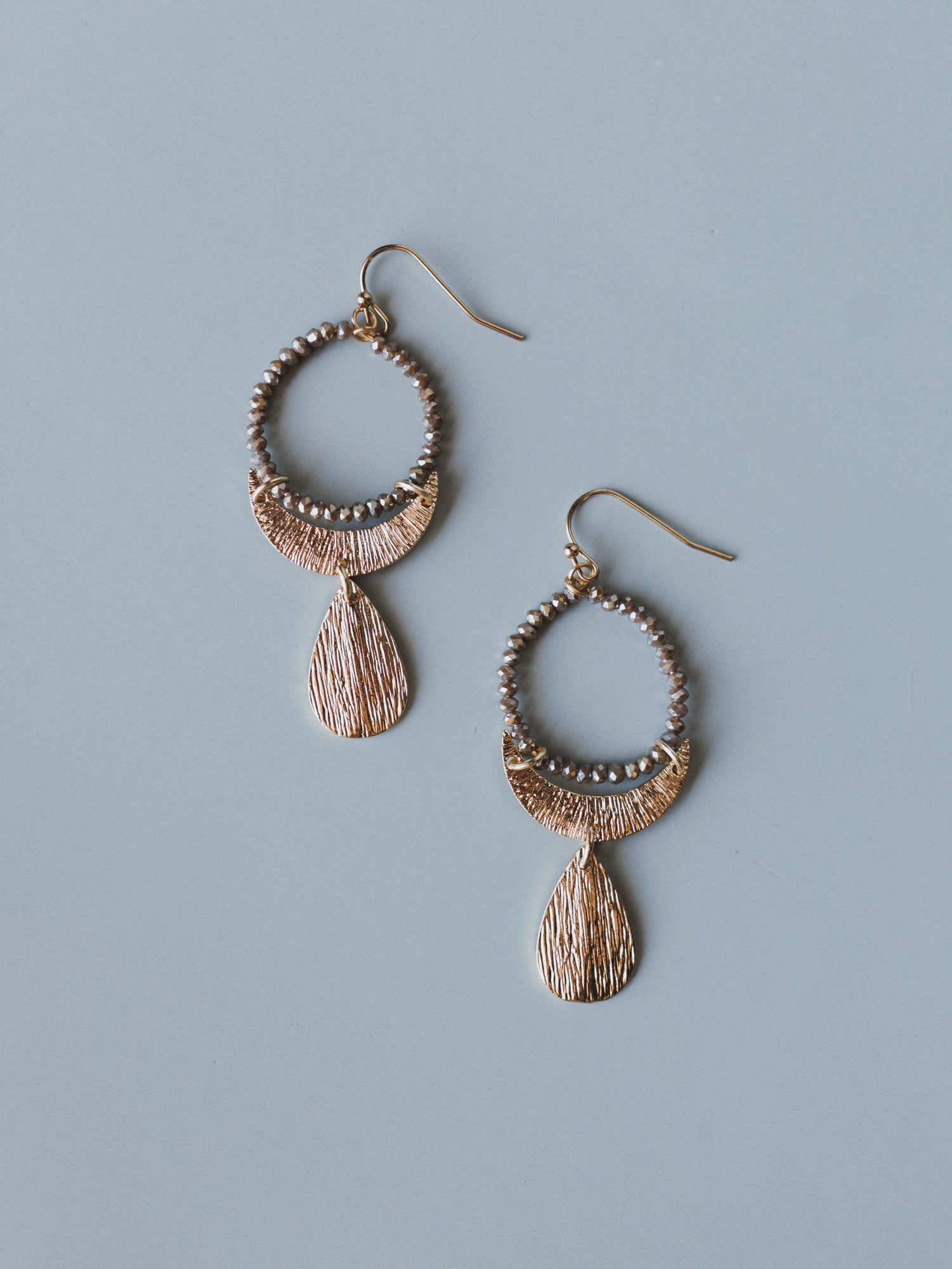 • Features a beaded crystal hoop in smoky grey and gold tones with a textured crescent moon charm and a hammered teardrop pendant that cascades beautifully for a multi-layered, eye-catching drop.