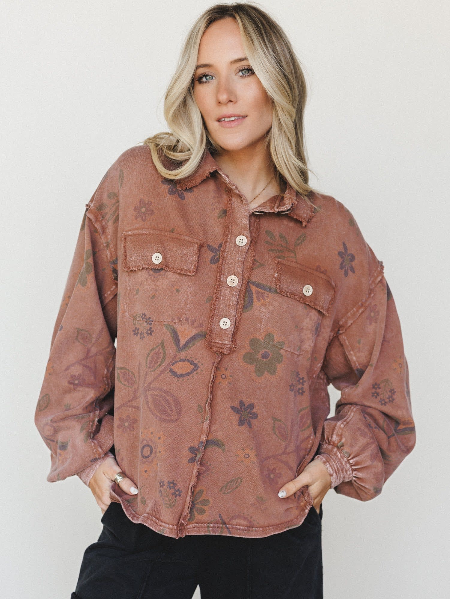 - Oversized button-front shacket silhouette in a washed terracotta fabric printed with an earthy, vintage-inspired botanical floral in olive, plum, and dusty blue.