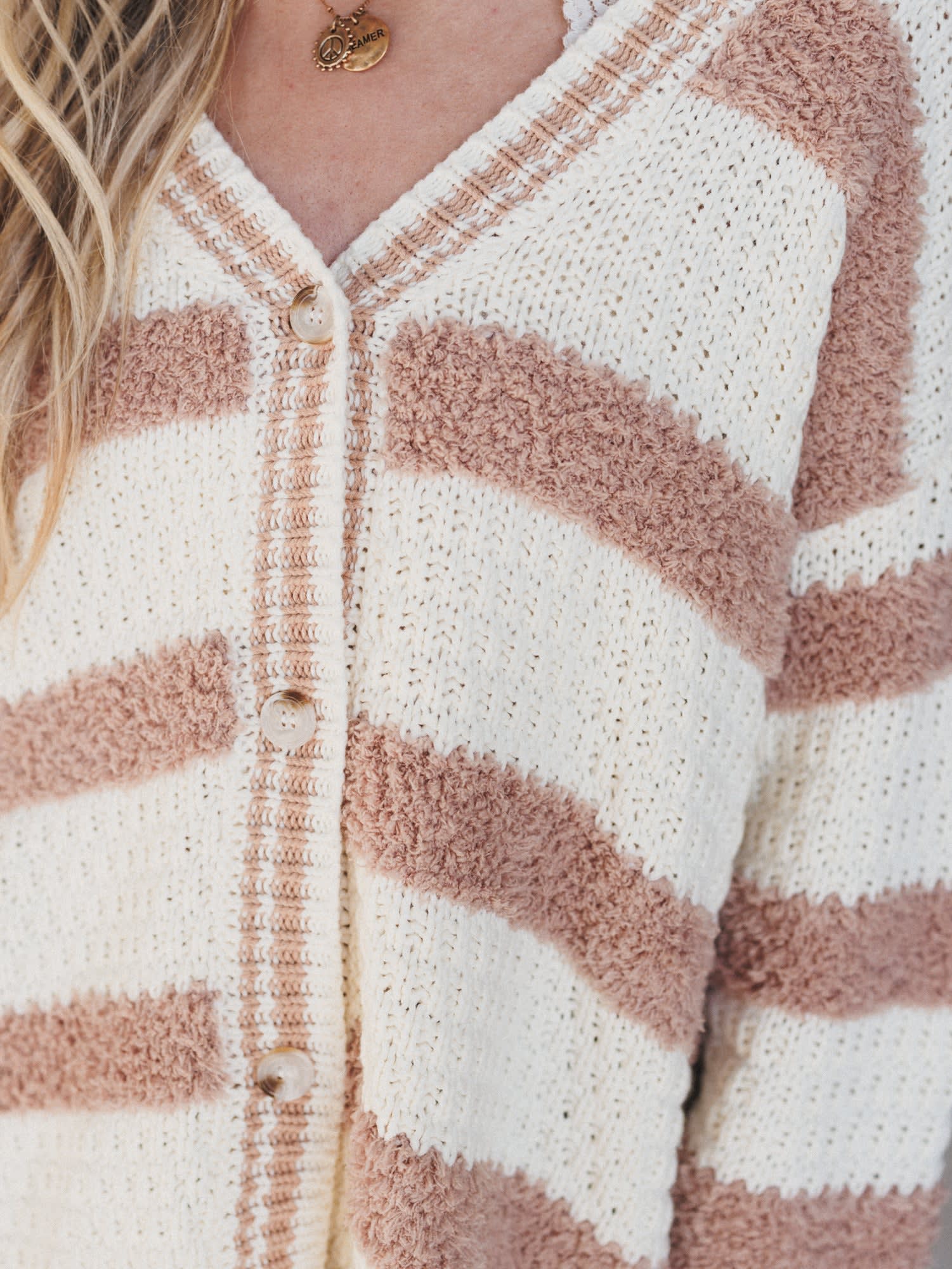 • Newport Button Down Cardigan: Oversized knit cardigan with soft blush and ivory stripes, button front, and drop shoulders for that laid-back, coastal feel