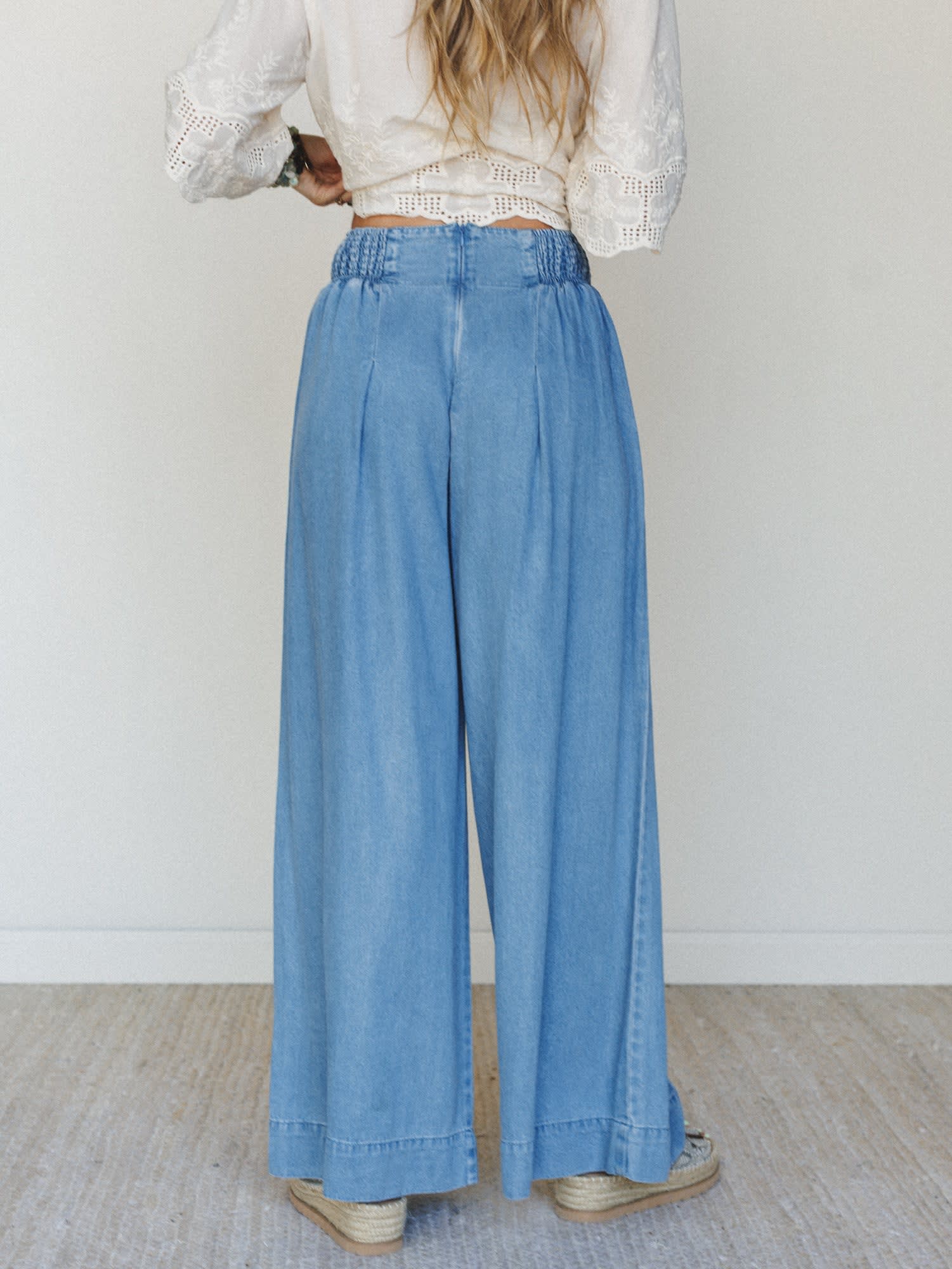 Perfect for those leisurely summer days when you need the ideal festival outfit that moves with you, these boho wide leg jeans bring effortless bohemian style to your wardrobe. The relaxed chambray fabric and flowing silhouette make these women's boho clothing essentials for any free-spirited adventure.