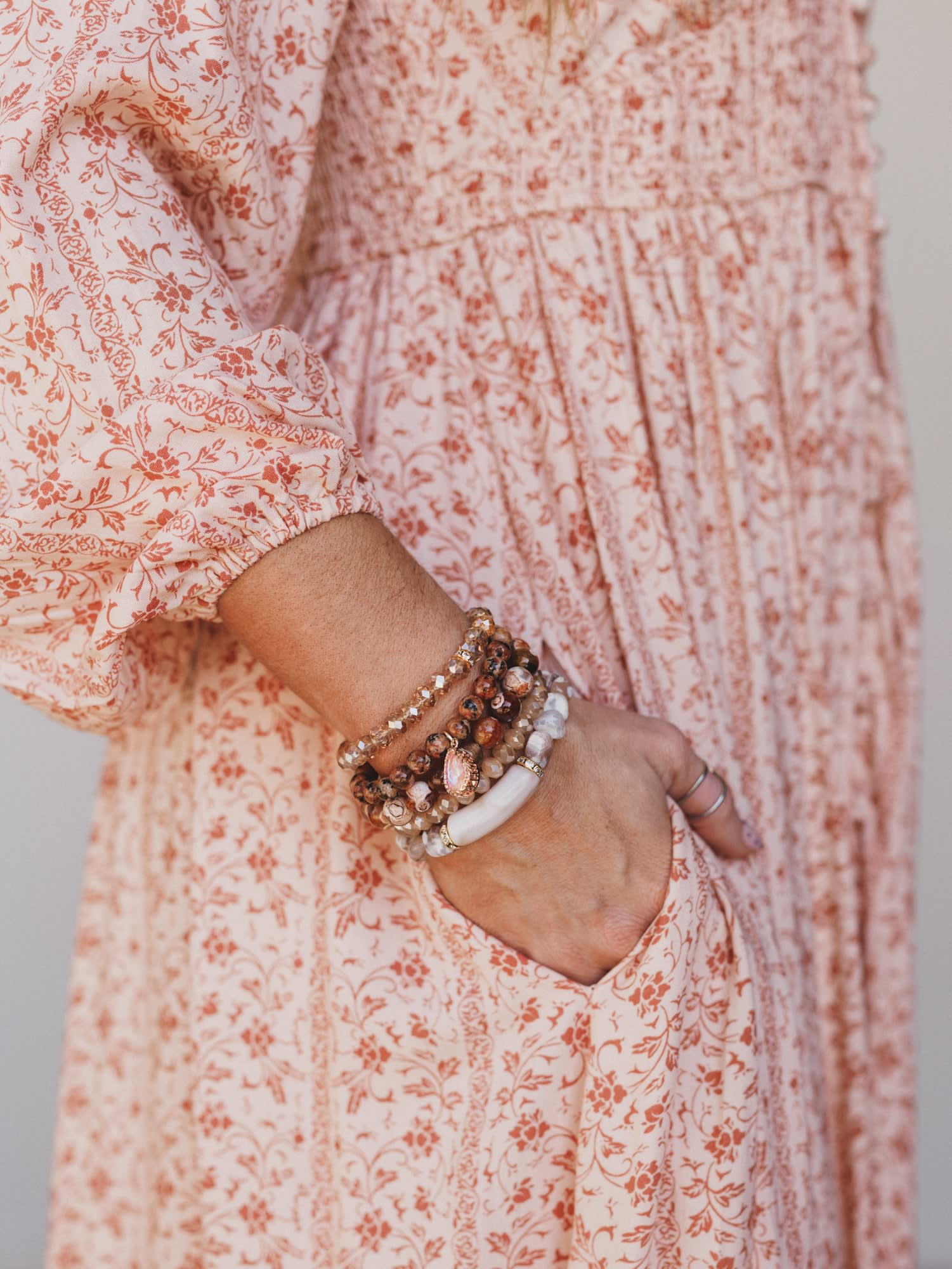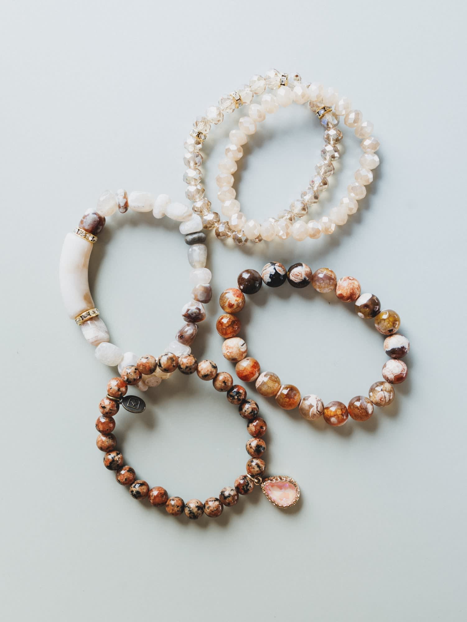 This dreamy stack is made for those golden-hour moments—think what to wear for date night on the patio or styling up your favorite boho maxi. With warm, earthy tones and soft shimmer, these beaded bracelets add that effortless layered look without you having to think twice.