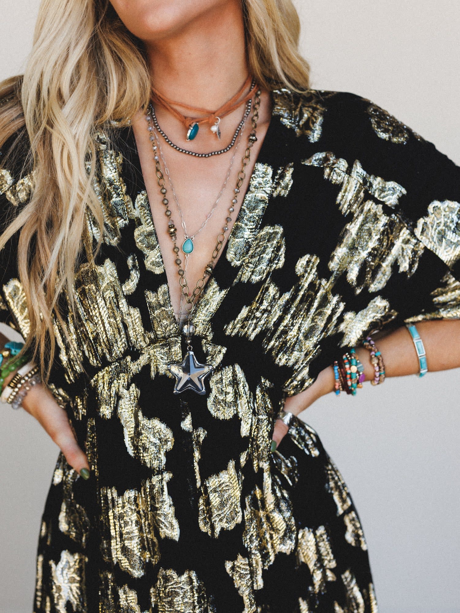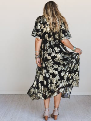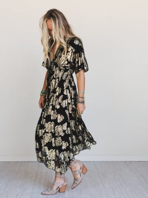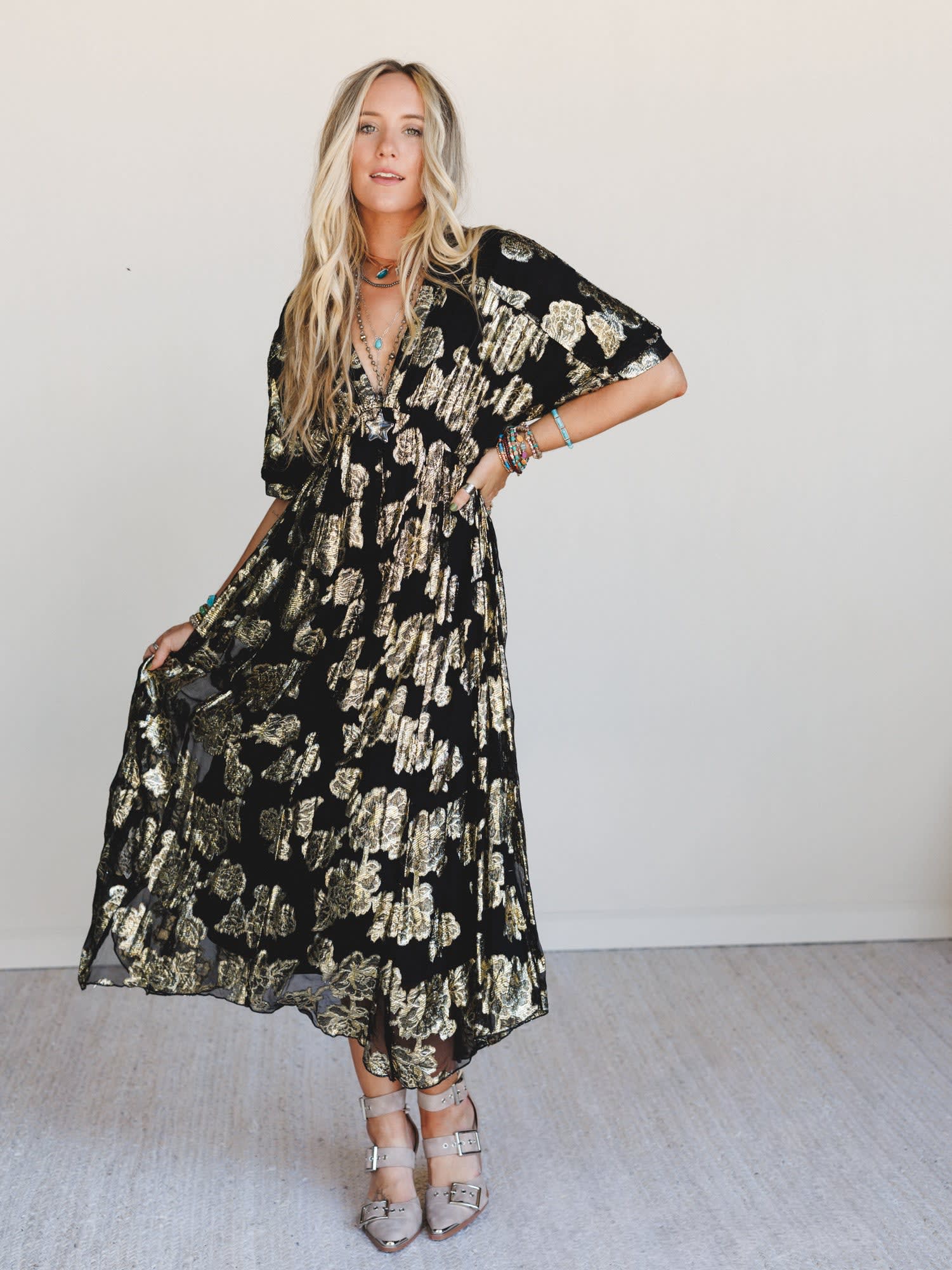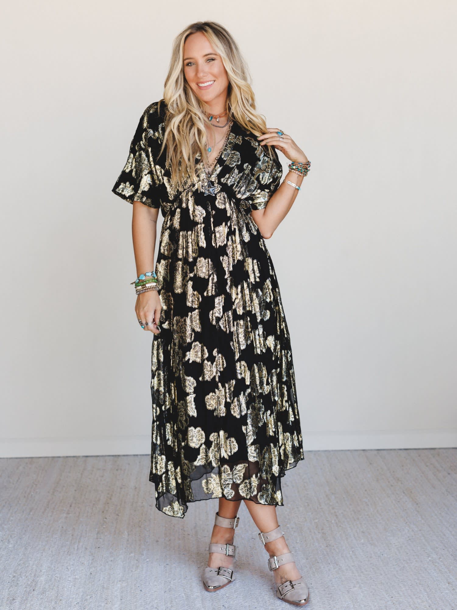 Bring a touch of magic to every occasion with the Nightflower Dress. This striking piece features a flowy silhouette adorned with shimmering gold floral accents, creating an effortless mix of bohemian charm and evening glamour. With its flattering cut and eye-catching details, it’s the kind of dress that makes an entrance—yet feels easy enough for all-night wear.