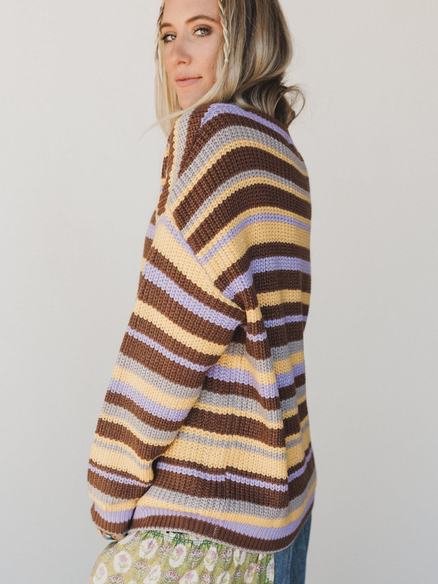 - Chunky knit in striped hues of chocolate, lilac, goldenrod, and stone