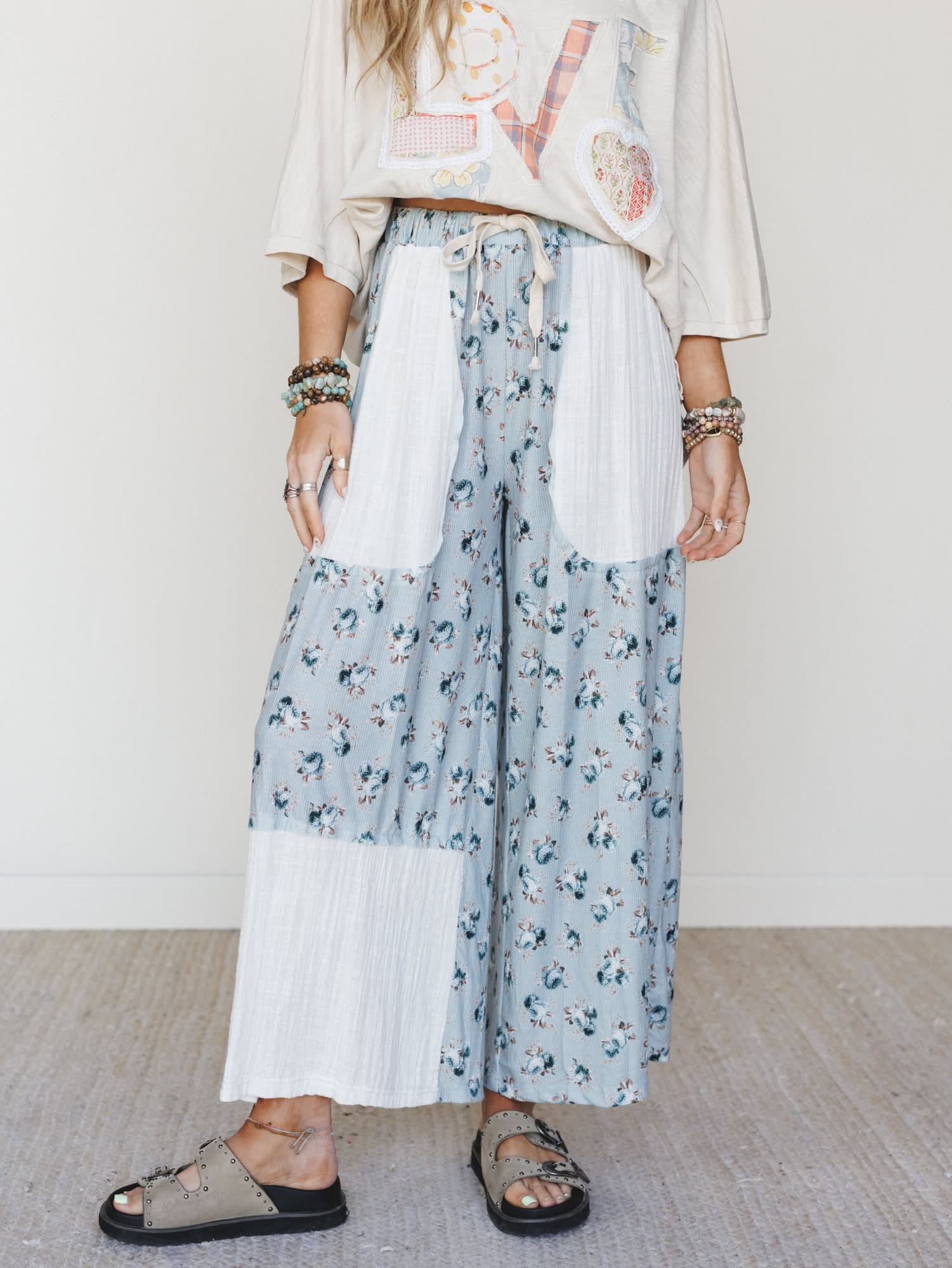 • Relaxed wide leg silhouette in a soft crinkle gauze fabric featuring a mixed patchwork design — dusty blue floral print panels paired with solid white crinkle sections for a collected, artisan feel.