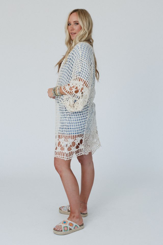 A classic boho staple with a beachy touch is our Off The Grid Crochet Kimono, this breezy kimono is perfect for that unique final touch on all your outfits!