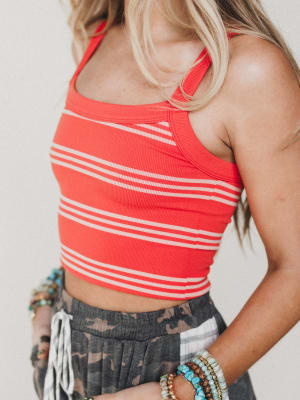 Sporty, bold, and ready for sunshine — the Off to Sail Stripe Brami brings a pop of color to your everyday lineup. With its vibrant coral hue and crisp stripe detail, this one was made for warm days and easy layering.