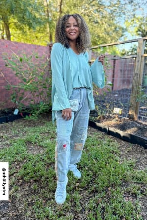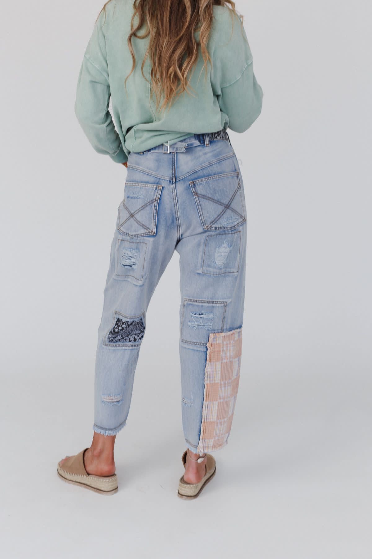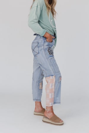 - Comfortable denim fabric with unique patchwork detailing throughout