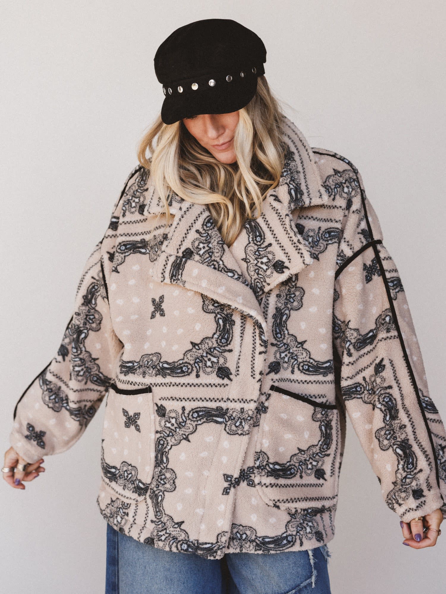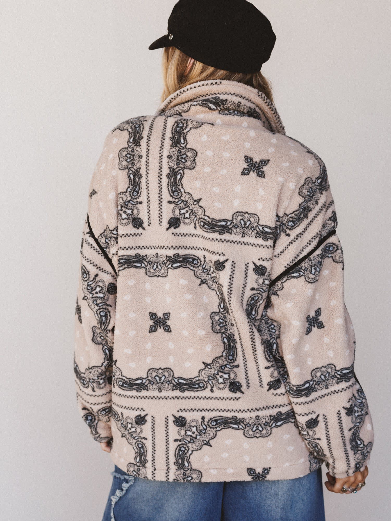 - Charmed Affair Printed Fleece Jacket: A cozy sherpa dream in a vintage-inspired bandana print. Featuring a full zip, oversized collar, and front pockets, this fleece jacket brings boho edge to chilly days.