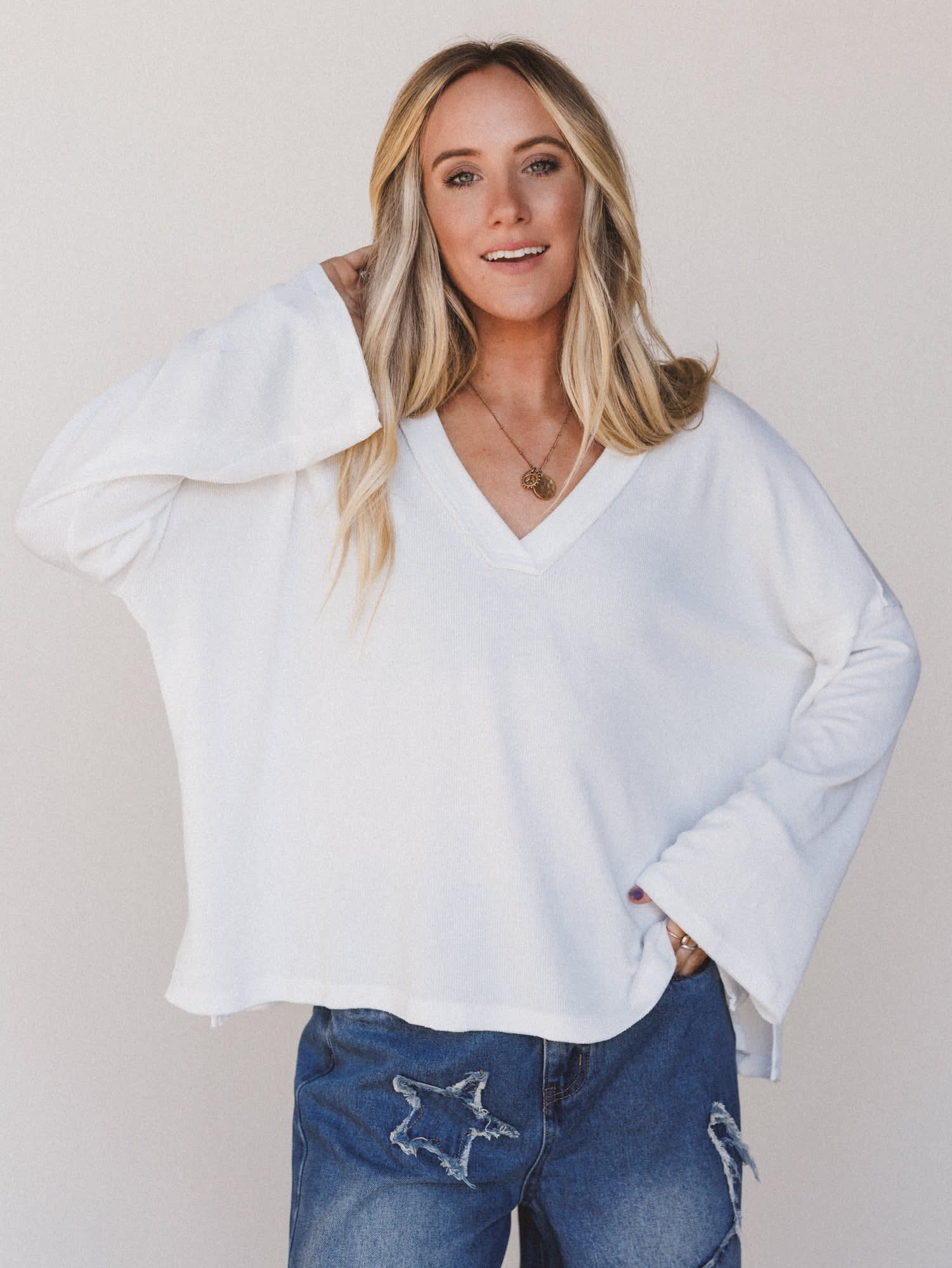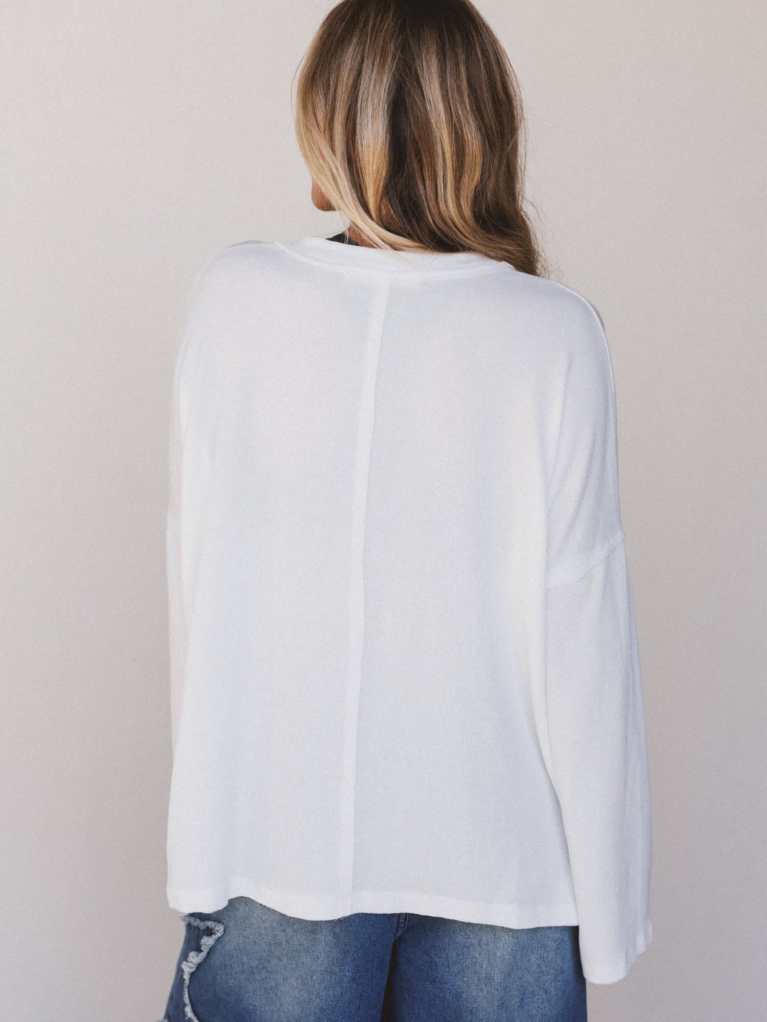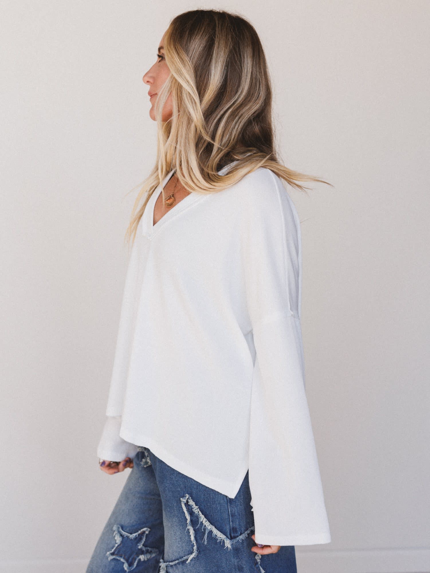 - The Nest On The Go Long Sleeve Tee: This oversized white v-neck top is a layering essential. Its relaxed fit and flared sleeves add breezy movement, perfect for lounging or layering under your favorite jackets.