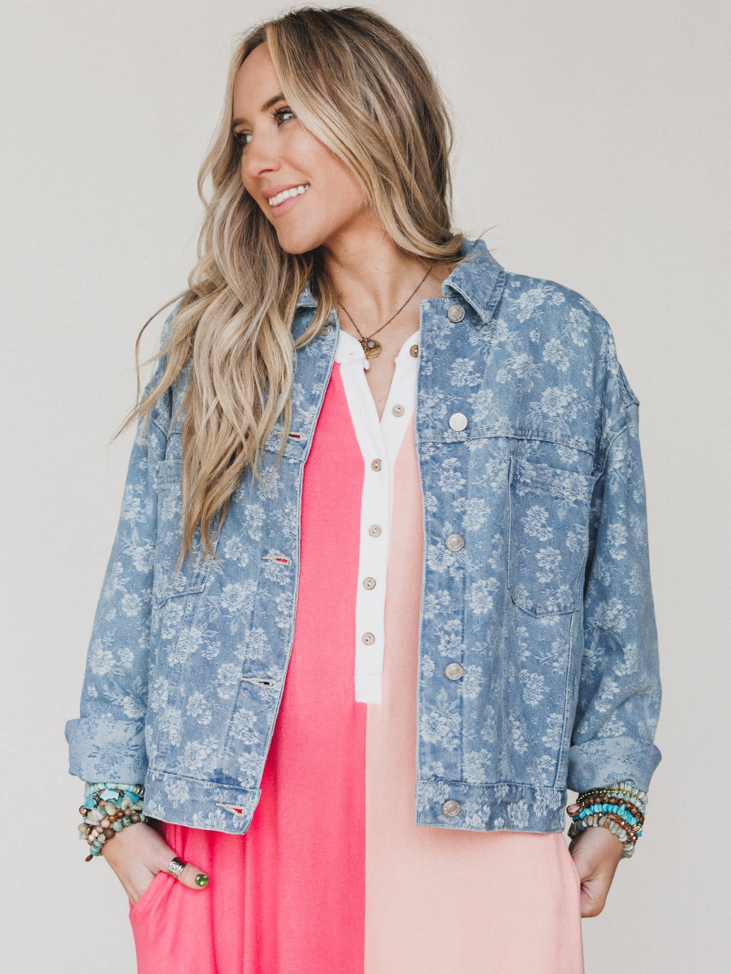 This is the layer you’ll keep reaching for. The On My Mind Jacket blends classic denim vibes with a soft floral twist for the perfect mix of edgy and feminine.