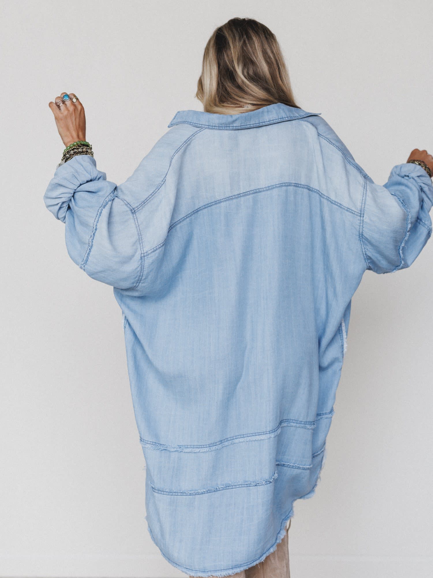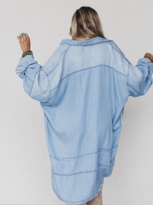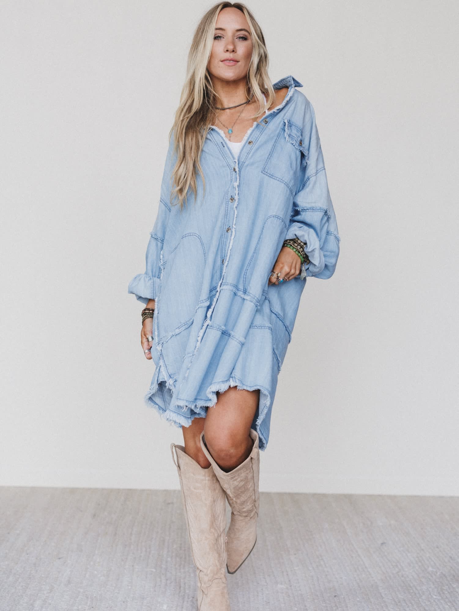 This boho denim dress is oversized for a laid-back look and pairs perfectly with tall boots.