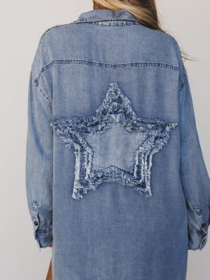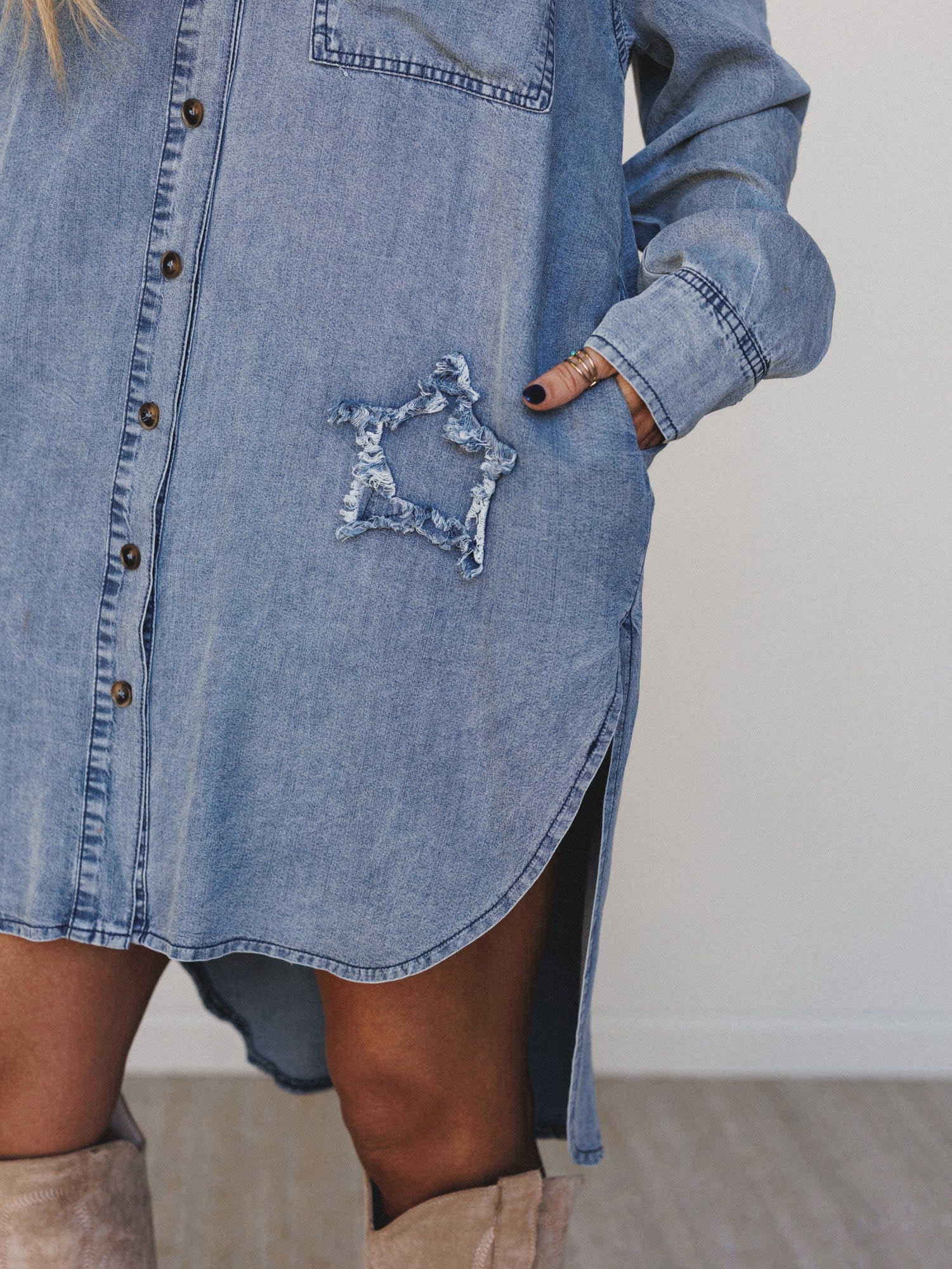 A star-studded take on classic denim, the Outrider Dress brings that cool cowgirl vibe with a touch of boho charm. Whether you're hitting the farmers market or dancing under the stars, this easygoing button-down is made for living wild and free.