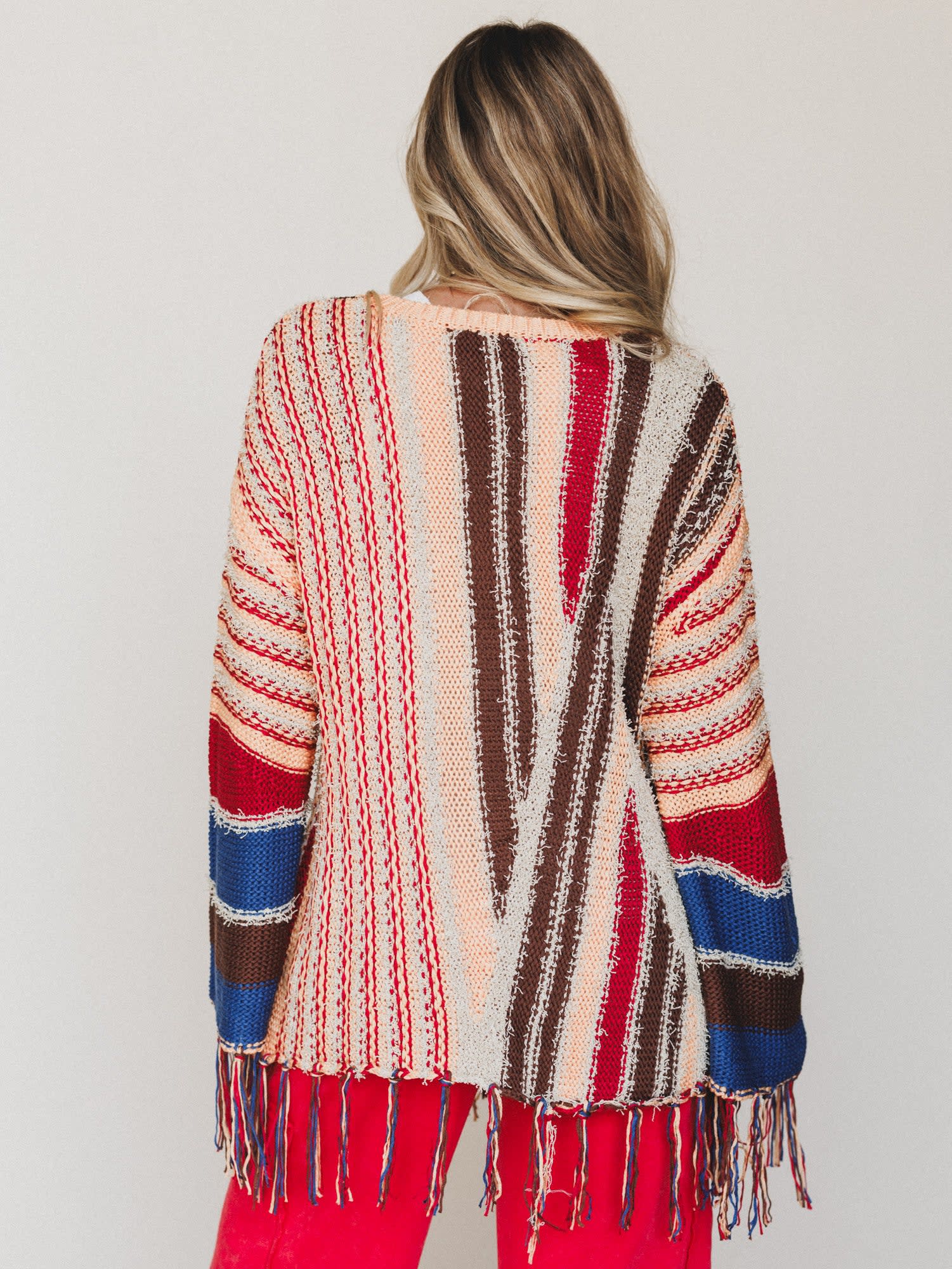 - Mixed stripe pattern with warm neutrals and muted pops of color