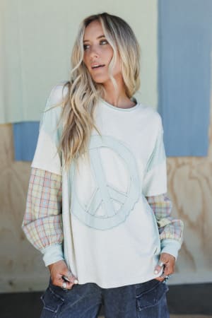 Level up your loungewear with this peace sign top that pairs perfectly with comfy wide leg pants.