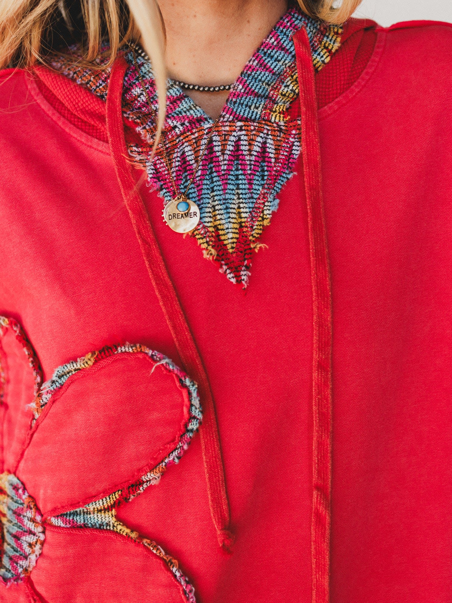 - Patchwork Poppy Sweater: A poppy-red hoodie with oversized flower appliqués and rainbow knit insets at the sleeves and hood. Cozy, vibrant, and full of vintage flair.