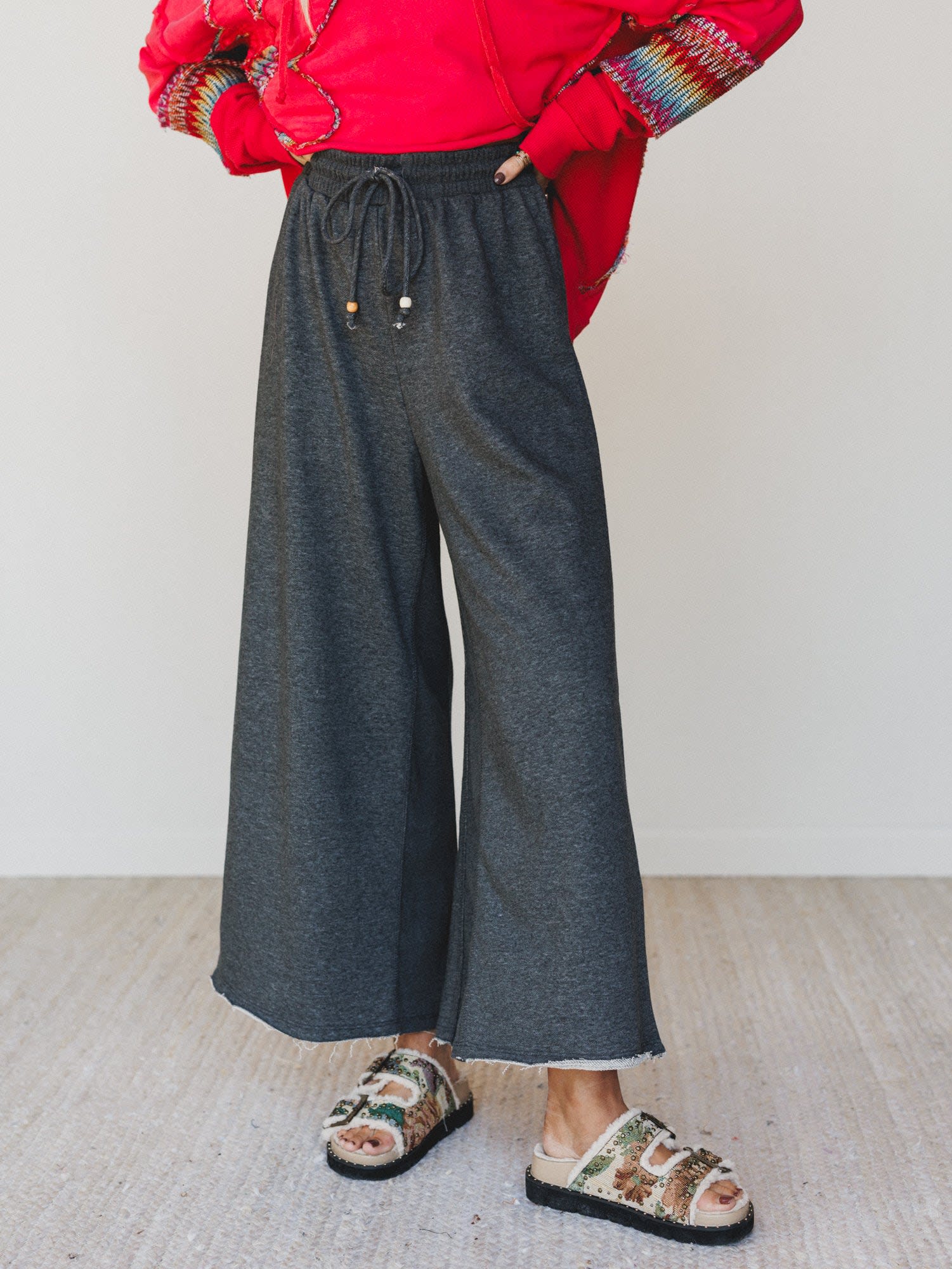 - The Nest Love Seeker Crochet Pocket Pants: These charcoal wide-leg knit pants are elevated with granny square crochet back pockets—hello, retro meets right-now.
