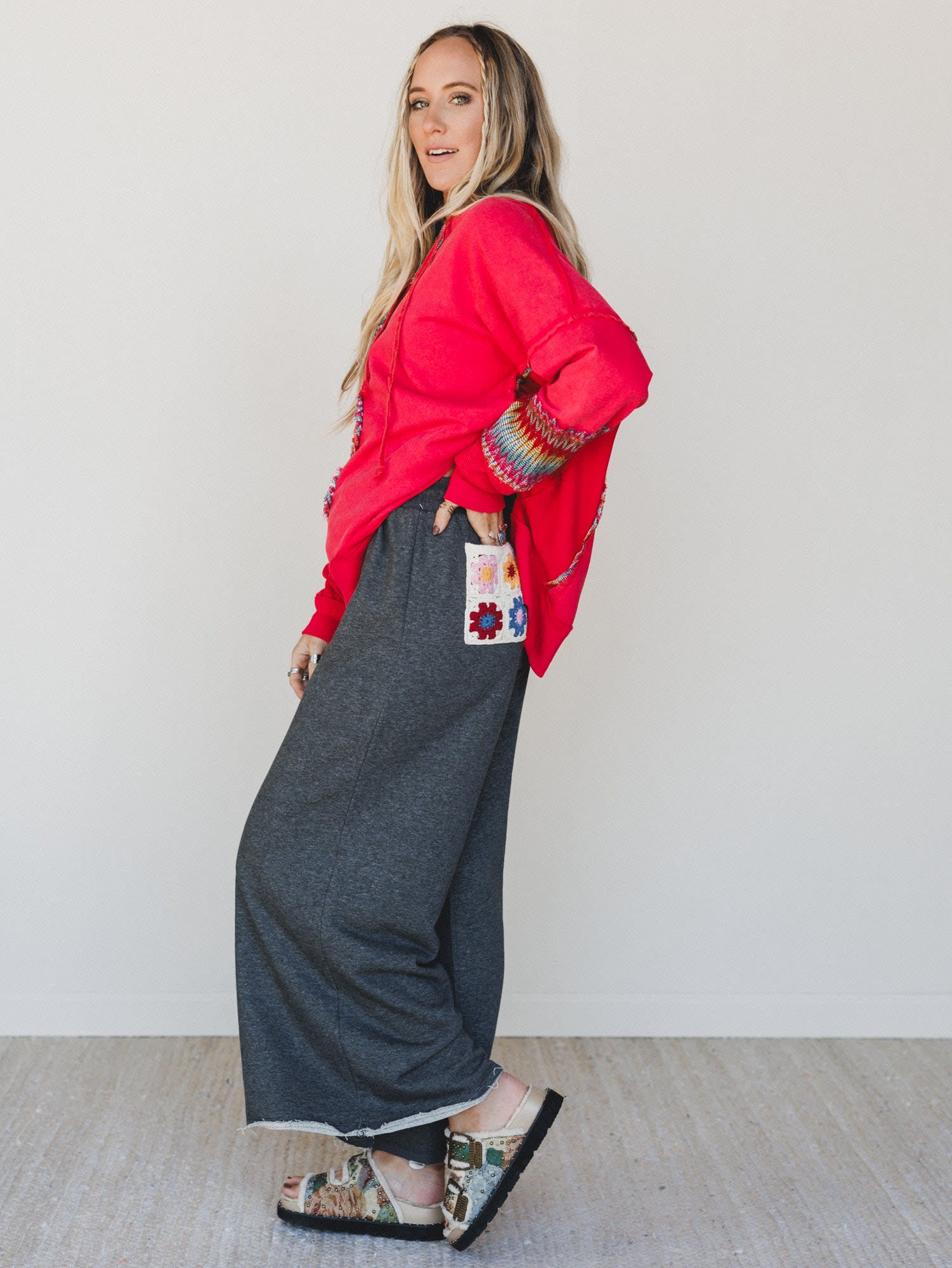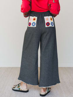 - The Nest Love Seeker Crochet Pocket Pants: These charcoal wide-leg knit pants are elevated with granny square crochet back pockets—hello, retro meets right-now.