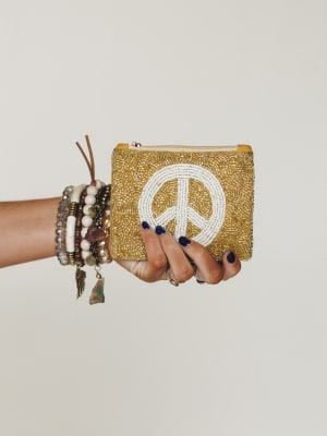 Keep your essentials close and your vibe peaceful with the Peace And Shine Coin Purse. This tiny treasure is full of personality, featuring shimmering golden beads and a bold white peace sign—because your style should sparkle just as much as your spirit.