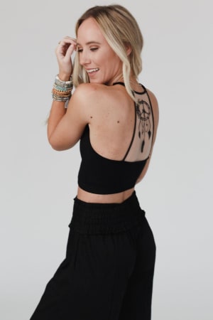 Our beautiful and delicate Peace Dreamcatcher Tattoo Bralette in a high neck, racerback style features a floral mesh panel, with stretchy & supportive seamless ribbed fabric. It has a high-neckline front with halter style adjustable shoulder straps and a contrast mesh back featuring the embroidery dreamcatcher tattoo detail. Non padded.