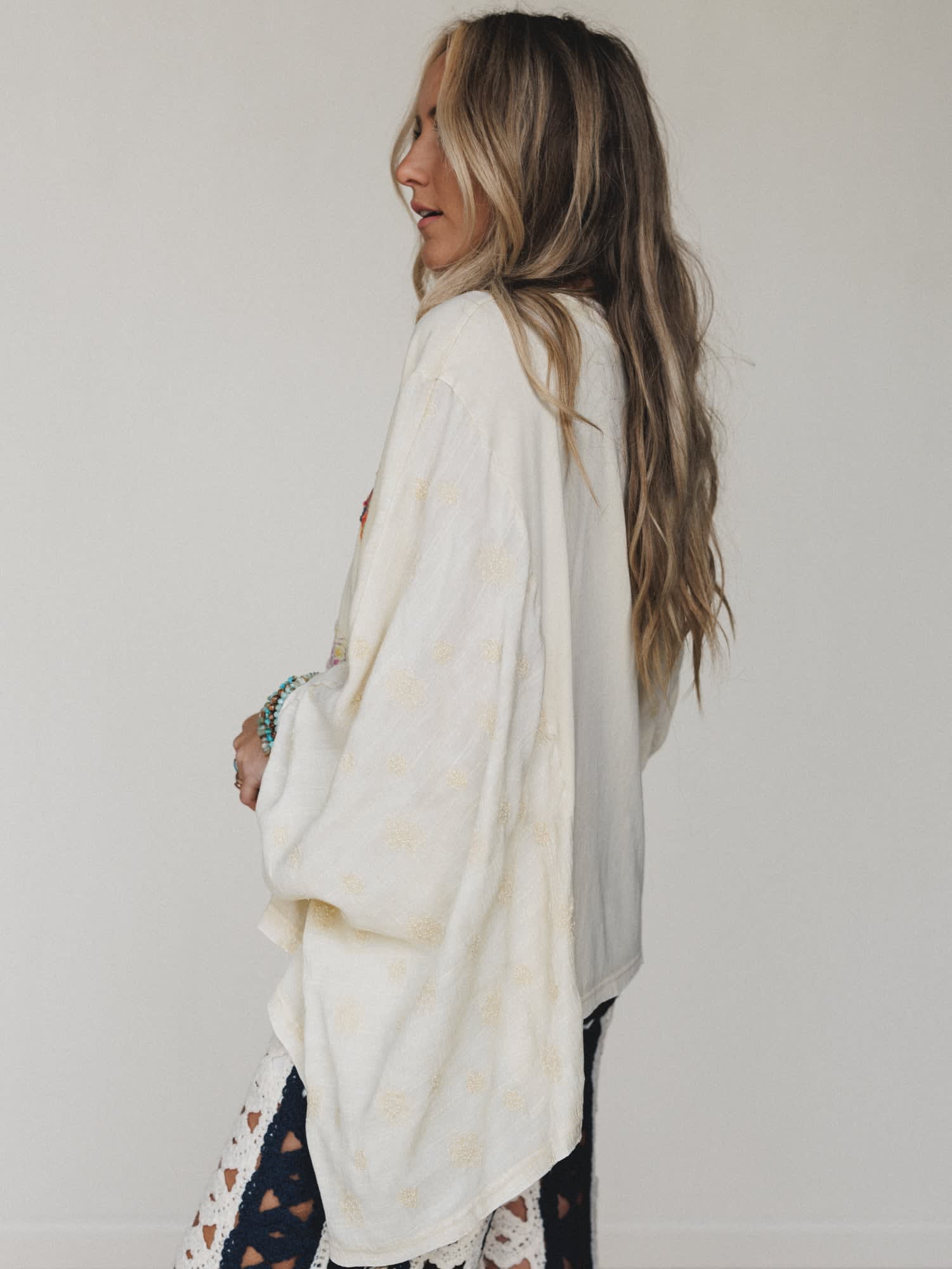 - Wide, flowy kimono-style sleeves