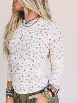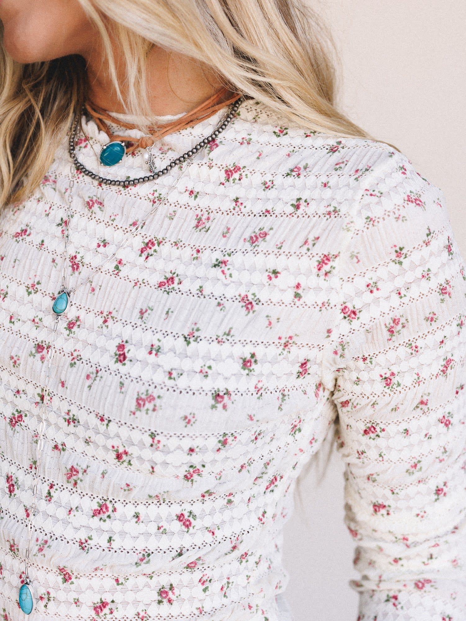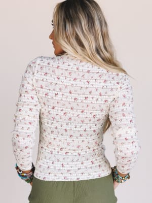 The Peach Blossom Floral Top is your go-to for delicate, vintage-inspired charm with a modern, flattering fit. With its dainty floral pattern and textured lace-like detail, this top adds soft romance to any day.