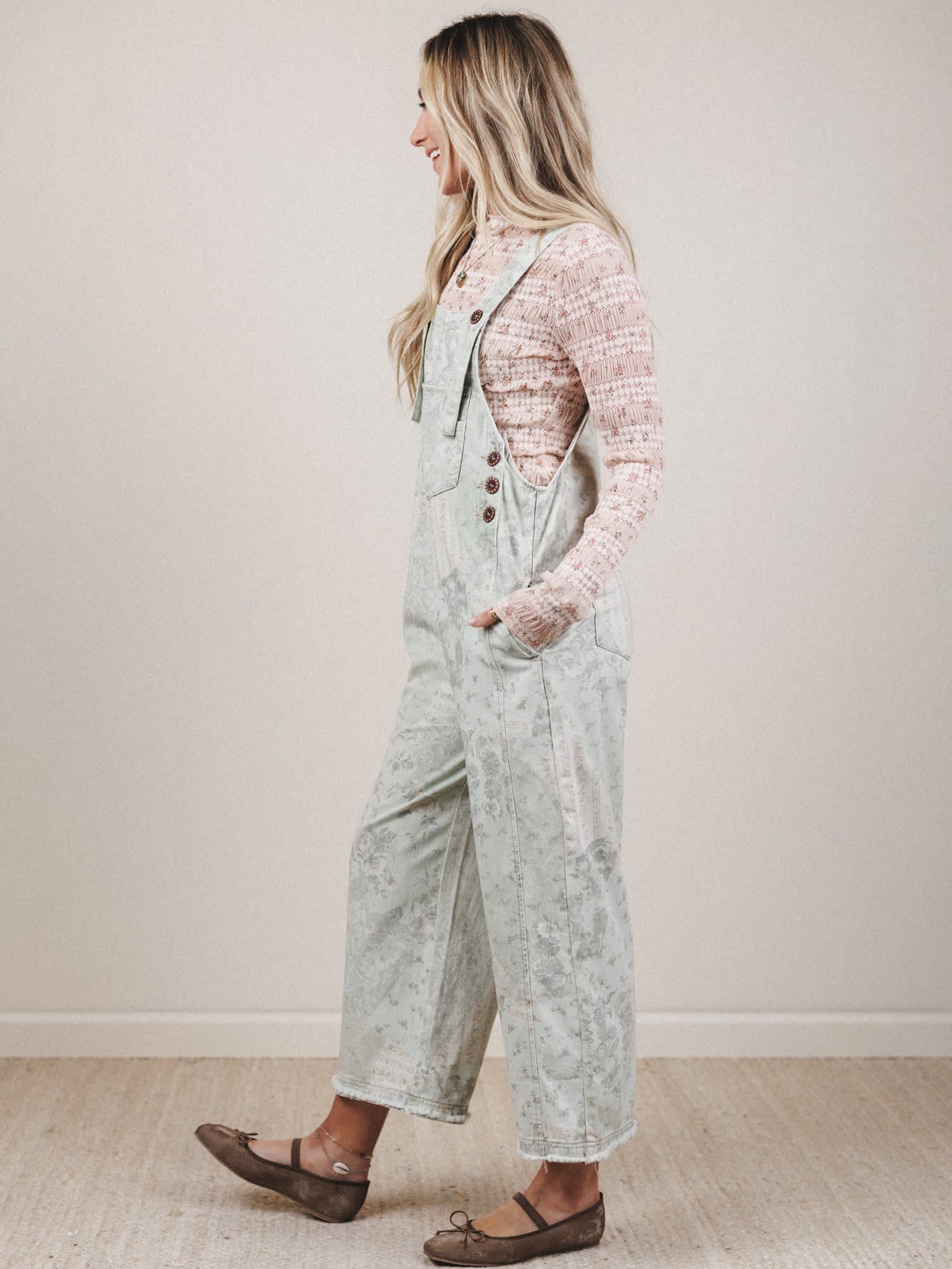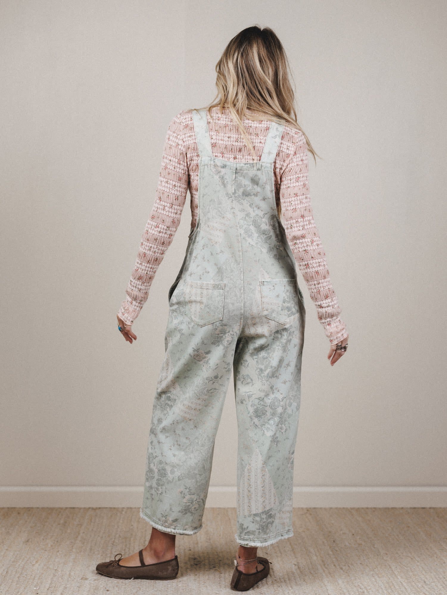- Sunset Flower Jumpsuit – A sage green overall-style jumpsuit with faded floral patterns and wooden button details. Relaxed fit with wide legs and patchwork charm that gives vintage-meets-modern flair.