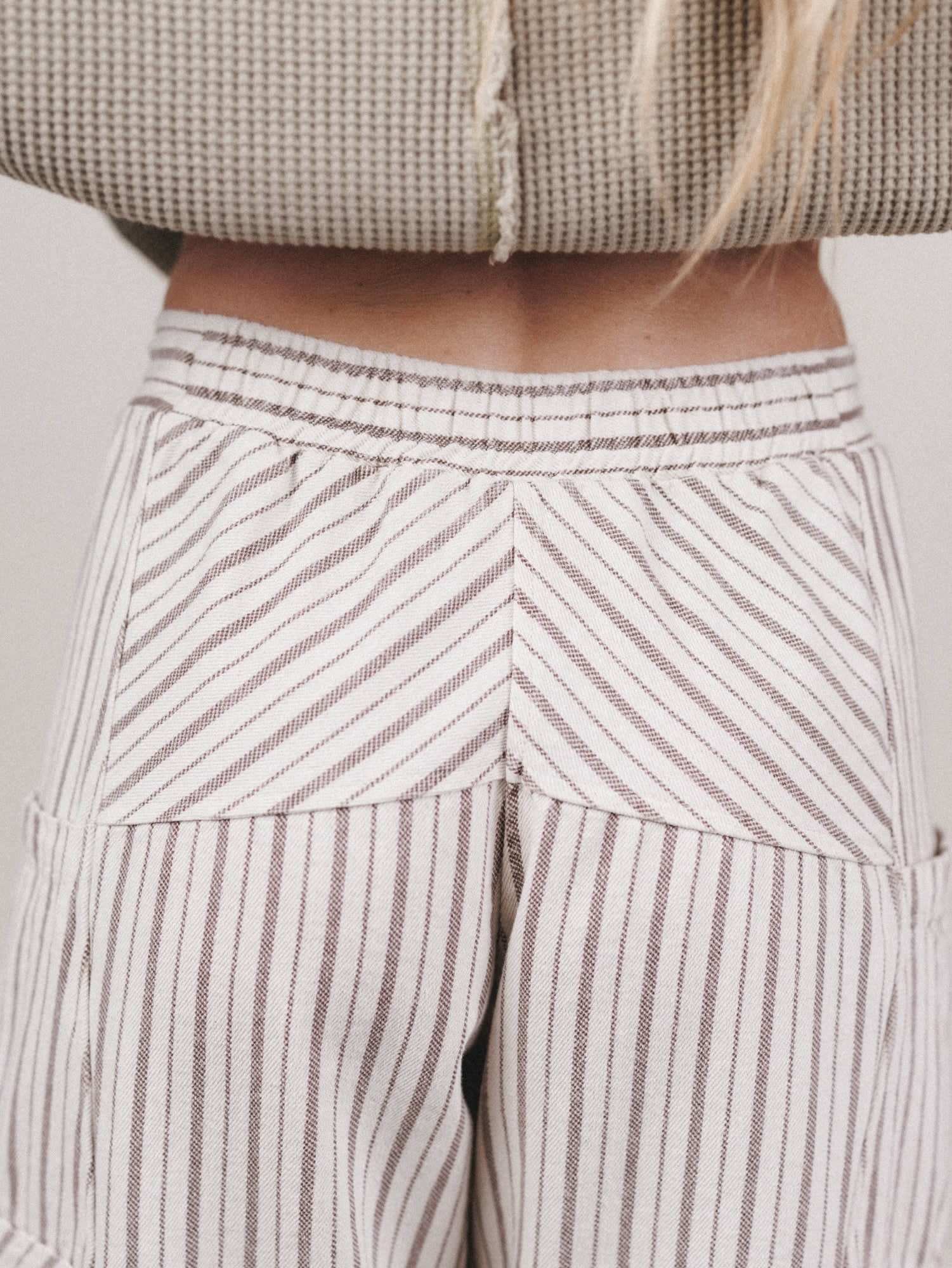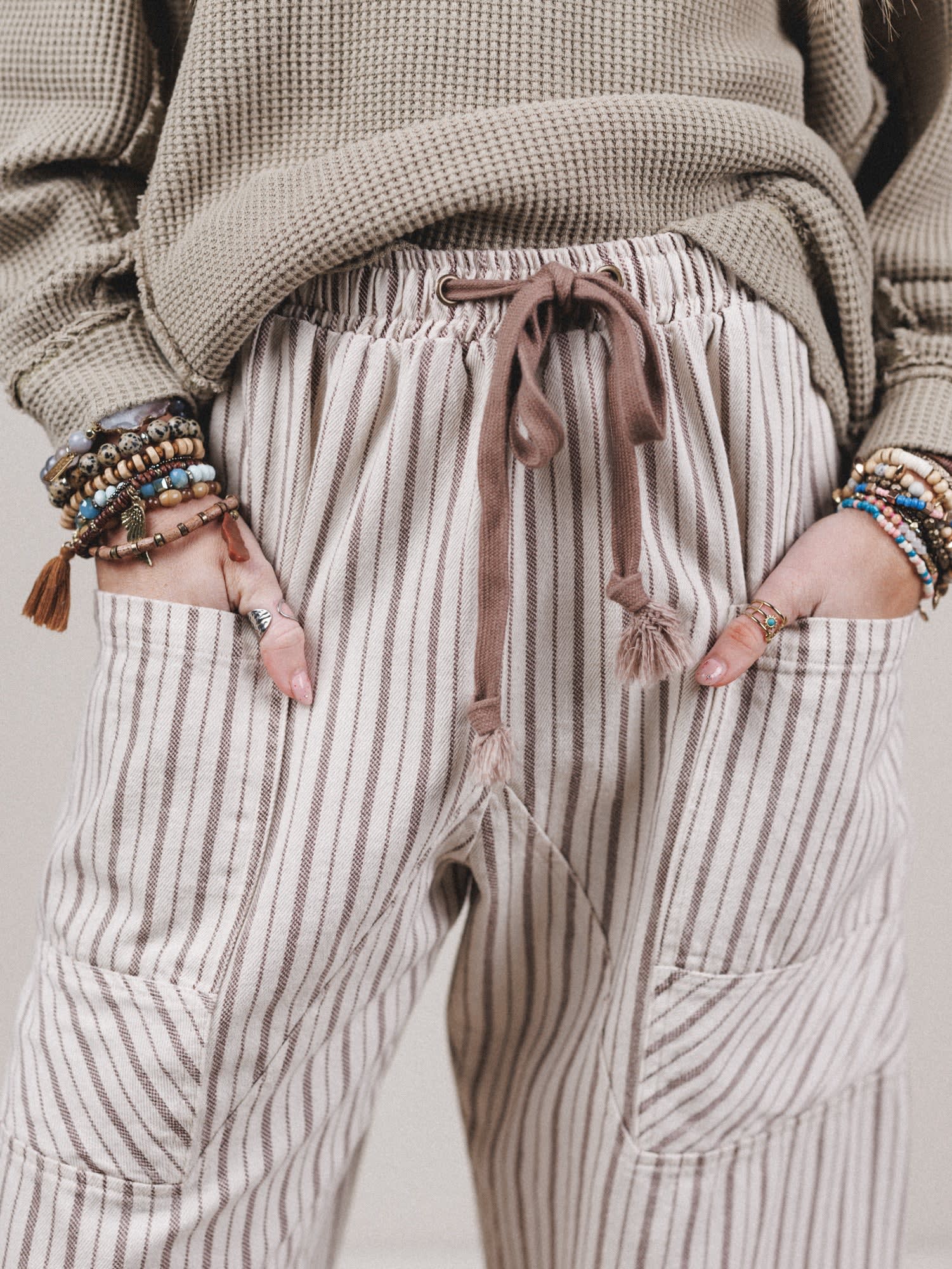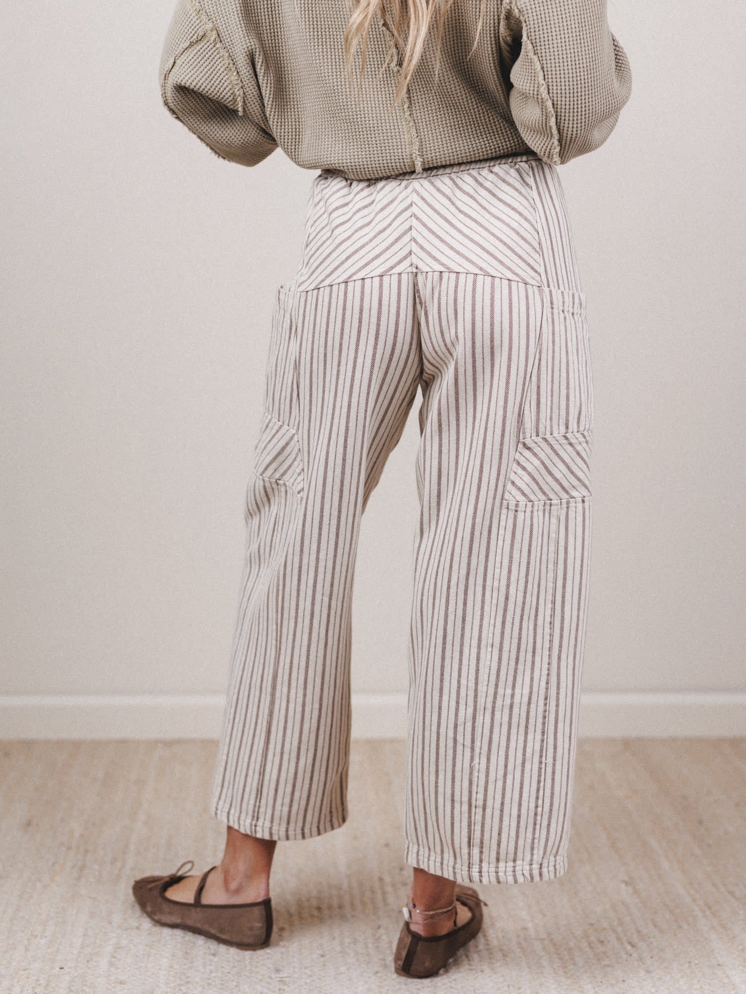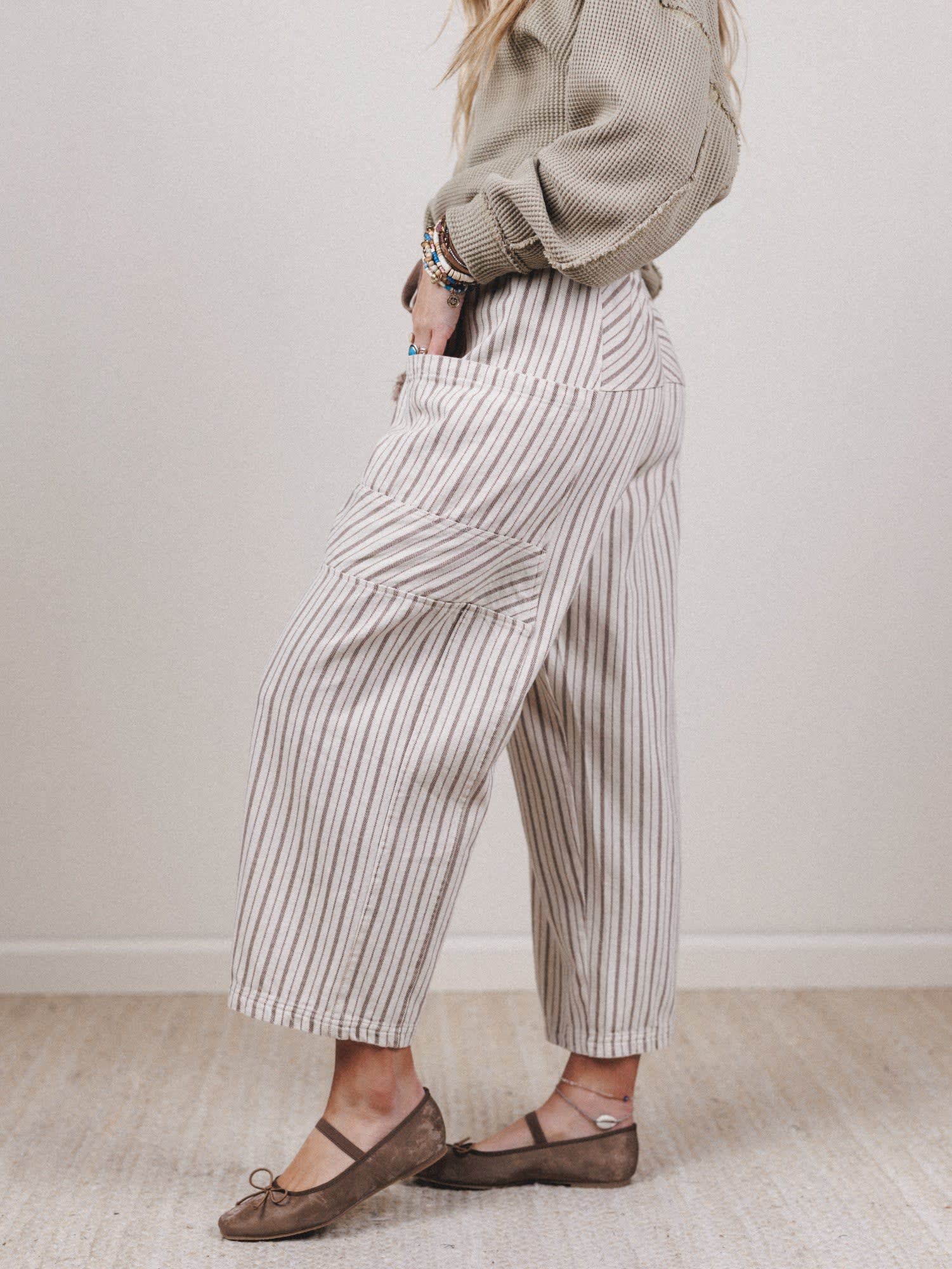 Slip into the Percy Striped Barrel Jeans and instantly feel the blend of effortless structure and laid-back charm. With a subtle taper, earthy tones, and artisan-inspired details, these pants are made for slow mornings, market strolls, and creative days.