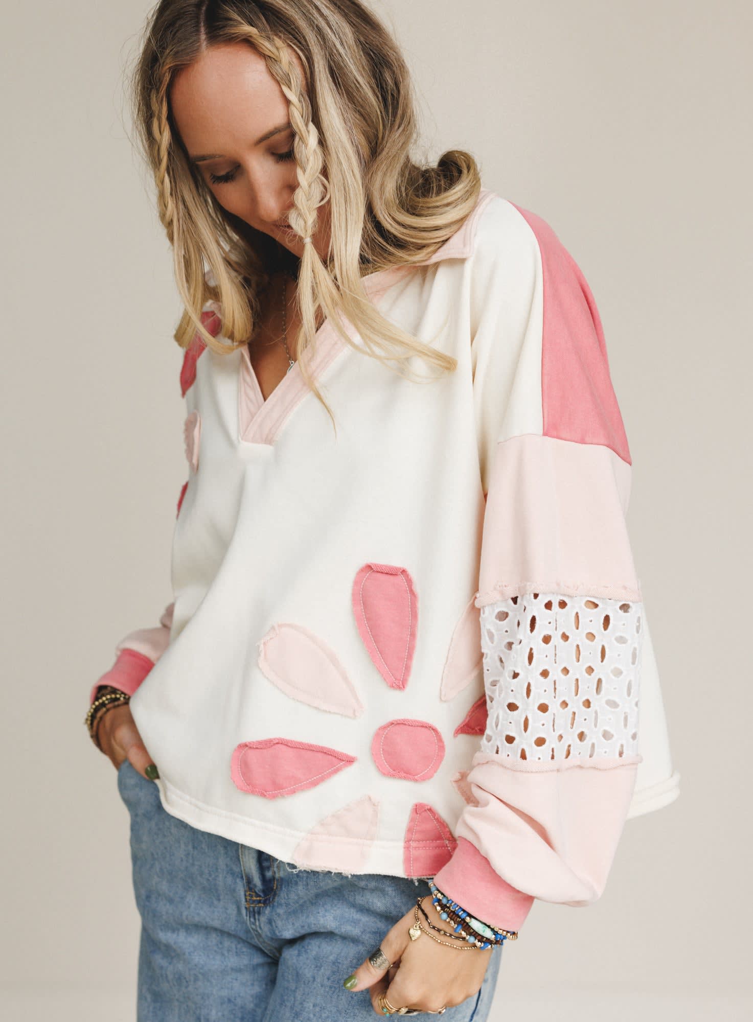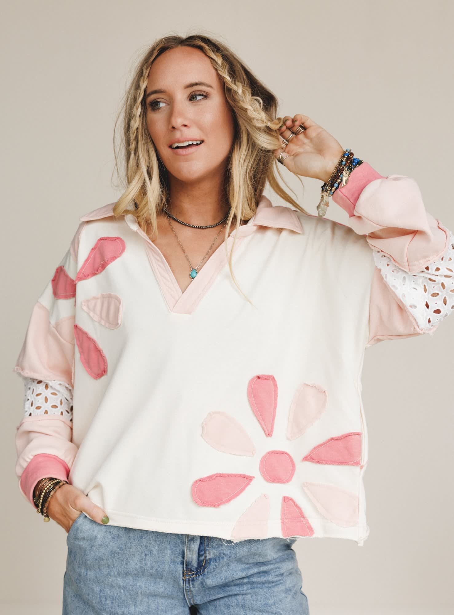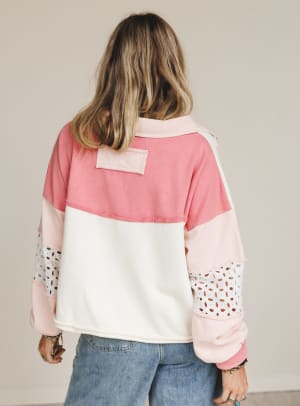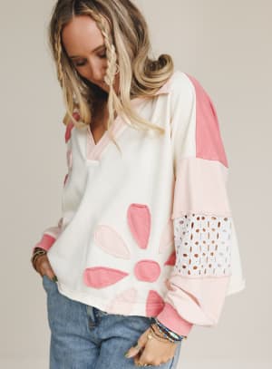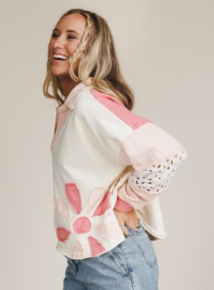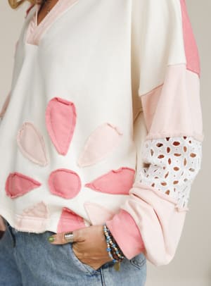 The Petal Wish Top is sunshine in sweatshirt form. With its playful floral appliqué and sweet eyelet details, this pullover brings a little bit of spring to every season.
