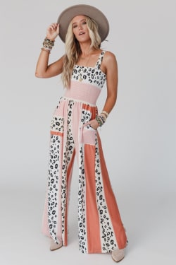- Serendipity Animal Print Jumpsuit: Lightweight smocked bodice with wide legs and pink + leopard stripe patchwork