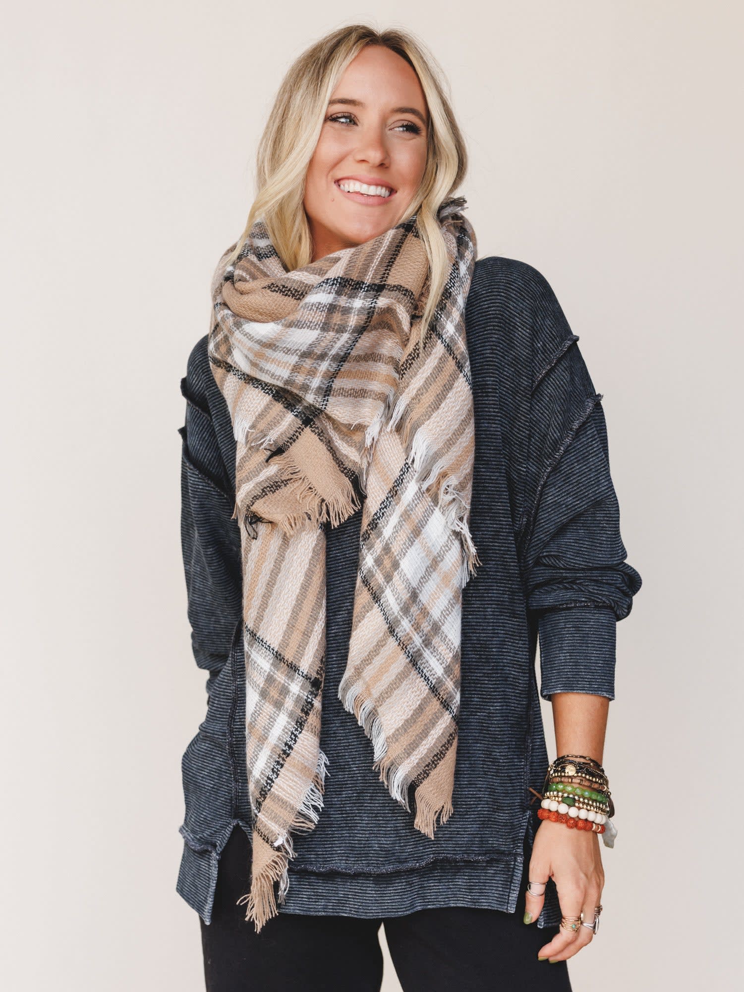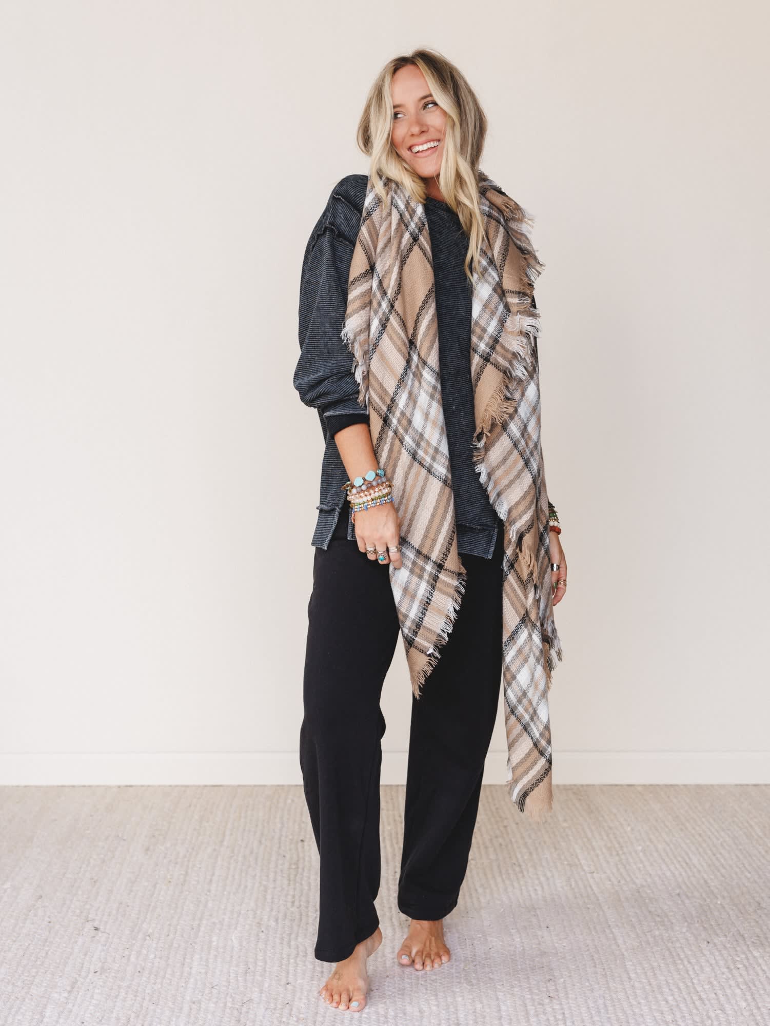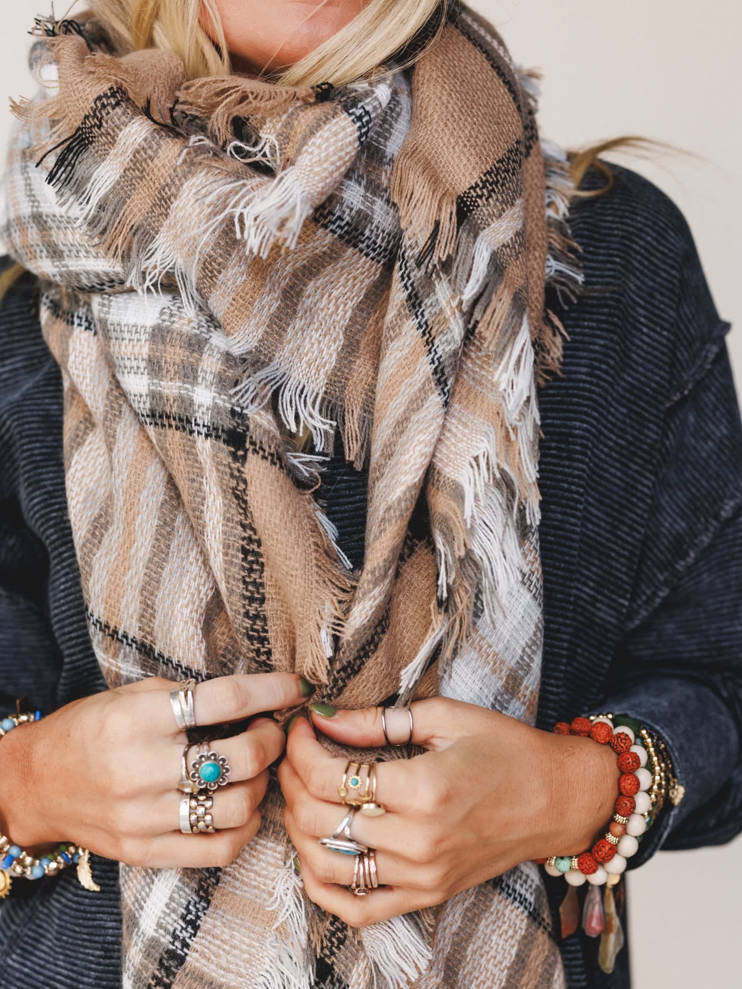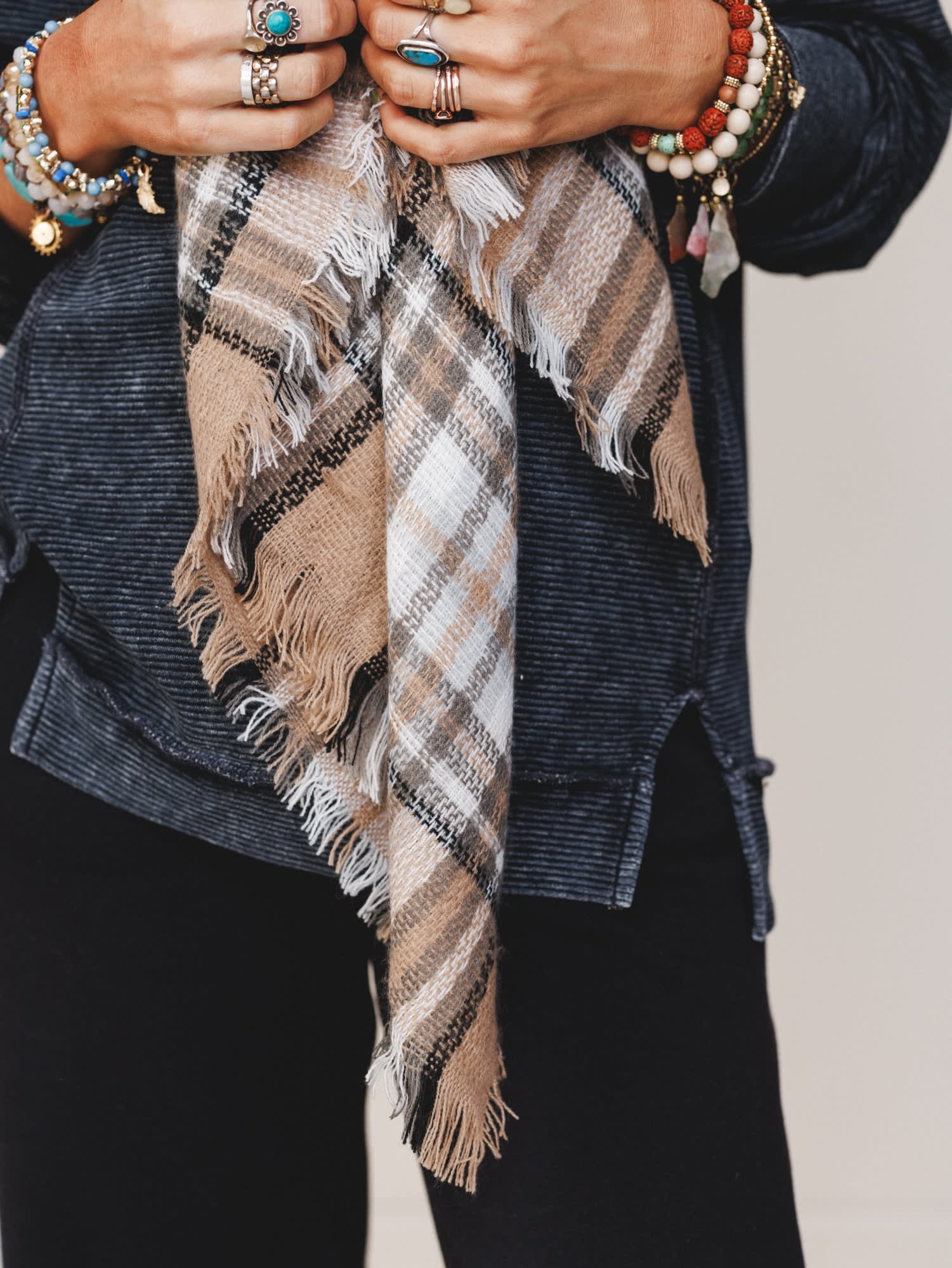 Wrap yourself up in cozy warmth and cool boho style in the Plaid Blanket Scarf - a statement piece that adds a touch of classic charm to your ensemble!