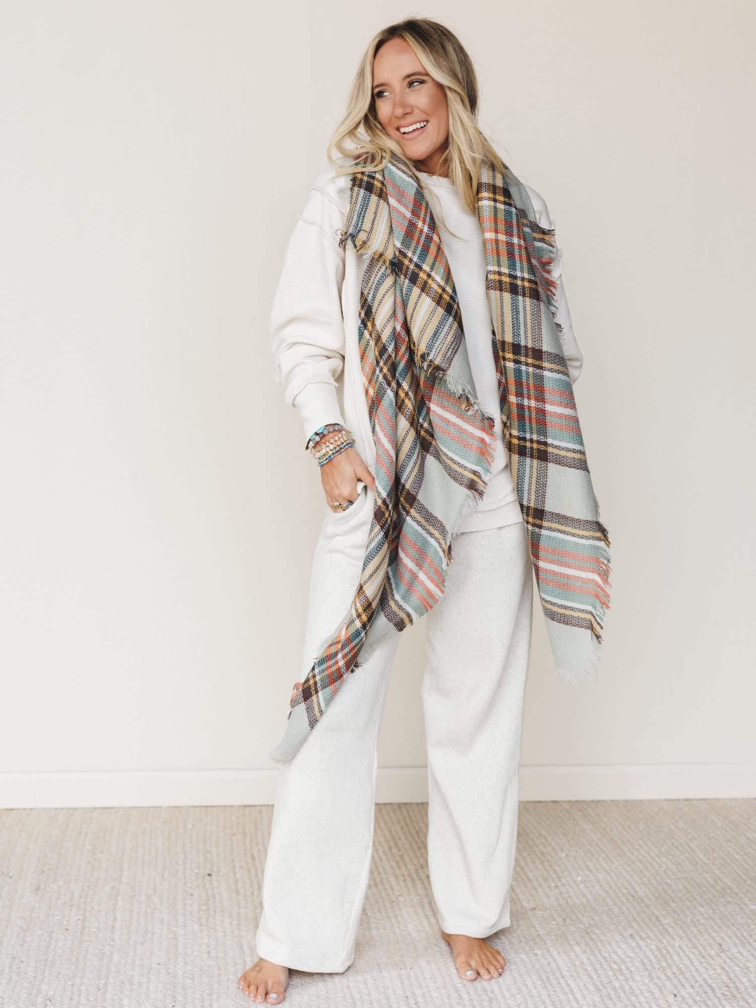 Wrap yourself up in cozy warmth and cool boho style in the Plaid Blanket Scarf - a statement piece that adds a touch of classic charm to your ensemble!